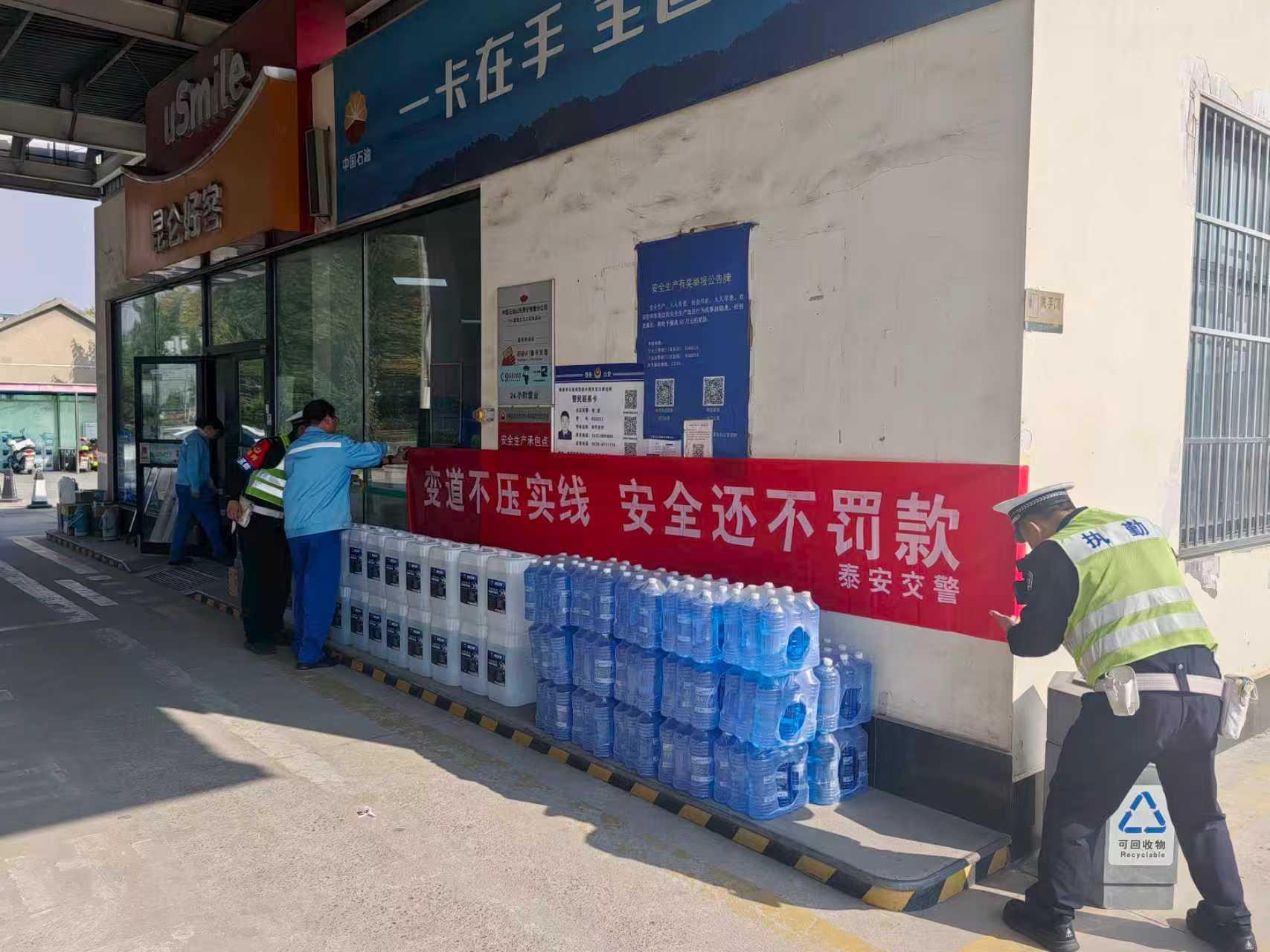 泰安交警岱西大队到加油站开展交通安全宣传,为安全出行加把油