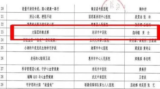社区文化网(苏勤 李统文)近日,中国老年医学学会脑血管病分会发布了《关于健康中国“脑⼼共筑健康领航”健康科普作品征集活动复审结果通知》组委会严格筛选近300件作品,经多轮比拼,42个佳作脱颖而出,射洪市中医院选送的视频类科普作品《大脑里的橡皮擦》突出重围,成功晋级决赛。于11月7日下午终极角逐,荣获视频类优秀奖。