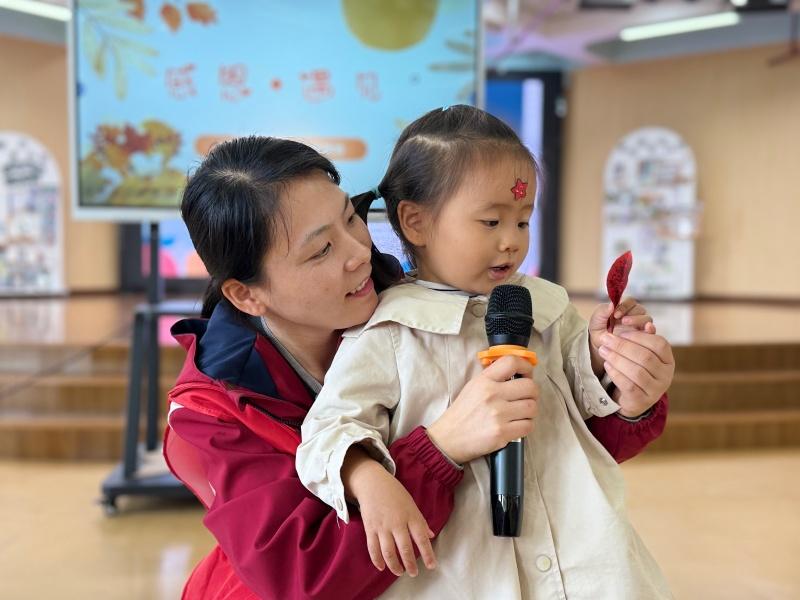 亲子制作完成后,孩子们身穿缀满树叶的“蝴蝶翅膀”,上演了一场精彩的视觉盛宴。他们跟随音乐节奏缓缓走来,有的转圈圈,有的踩着小碎步模仿蝴蝶飞舞,镜头里满是“把秋天穿在身上”的可爱身影。