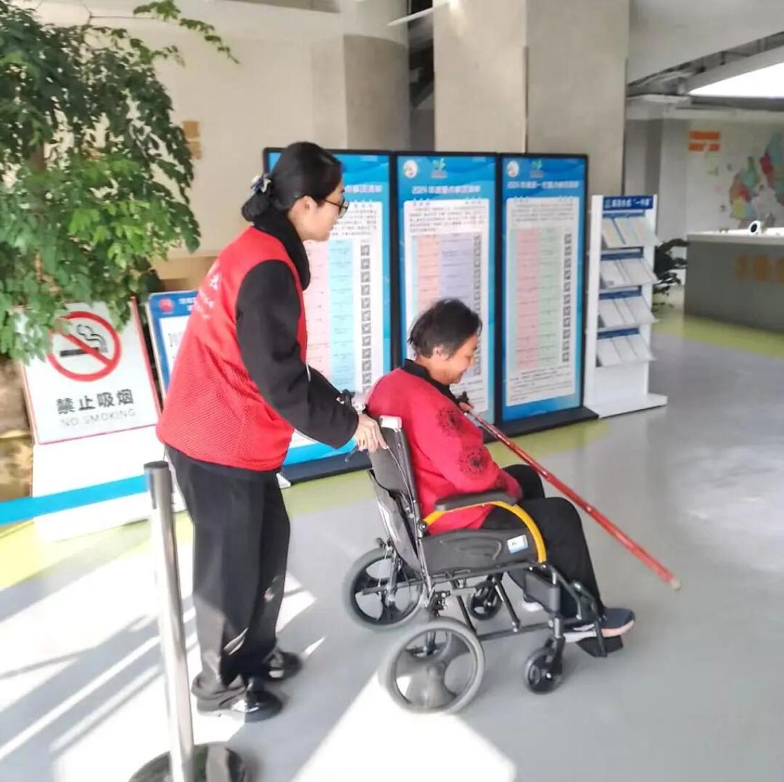 近日,张阿姨来到政务大厅办理医保业务。因腿部患有旧疾,行走起来比较困难,脸色也有些苍白。正在大厅值守的导服人员见状,主动上前询问情况,了解情况后,第一时间从便民服务站推来爱心轮椅,并细心的为张阿姨调整座椅高度和扶手位置,同时一边推着轮椅,一边耐心询问业务需求。通过无障碍通道将张阿姨送到医保服务窗口,并协助阿姨递交材料、核对信息,遇到老人看不清的表格内容,逐字逐句轻声解读,原本需要半小时的业务,在导服人员的协助下仅用十分钟便顺利办结。