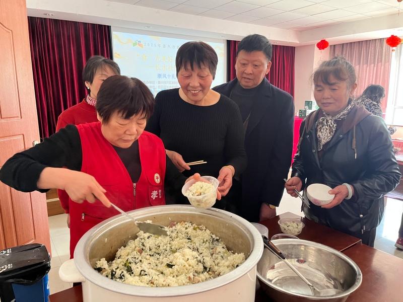如果说各家拿手菜是“各显神通”,那么社区为大家统一准备的经典咸肉菜饭,则成了本次活动当之无愧的“人气王”!当一大锅热气腾腾、香气扑鼻的咸肉菜饭被端上来时,立刻引发了居民们的集体“回忆杀”。那咸香适口的五花咸肉,与清甜的小青菜、糯香的米饭完美融合,锅底还带着一层焦香的锅巴。大家排着队,人手一碗,吃得津津有味。“冬天吃上这么一碗热乎乎的菜饭,真是暖心又暖胃!”“没想到在社区里能吃到这么地道的咸肉菜饭,太幸福了!”居民们的一致好评,让这碗朴实的菜饭成为了连接邻里情感的温暖纽带,将整个活动的气氛推向了高潮。