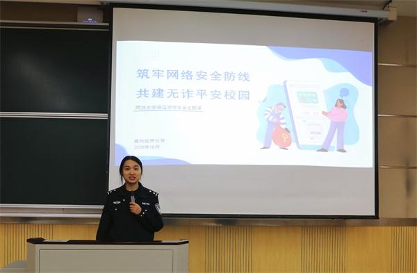 接着,嘉兴市公安局经开分局沈警官为同学们带来了一场内容丰富、形式生动的反诈知识讲座。沈警官以《中华人民共和国反电信网络诈骗法》为核心,系统解读了相关法律法规和政策措施。她结合当前高发的诈骗类型,深入浅出地讲解了包括“两卡”(电话卡、银行卡)犯罪的危害及如何拒绝成为“两卡”工具人、网络购物诈骗的常见套路、刷单返利的欺诈本质以及虚拟游戏交易中的诈骗陷阱等多个关键议题。