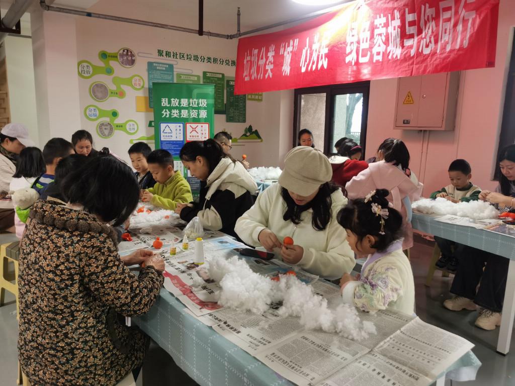 随后,手工制作环节正式开始。现场准备了废纸、旧棉花、树枝、气球等废旧材料,孩子们在家长的陪伴下,发挥想象力,将它们改造成为一个个充满创意的作品。有的孩子将气球和旧棉花填充成柿子形状,用废纸剪成树叶,挂在树枝上,制作成寓意“柿柿如意”的小摆设;有的孩子则将废纸折叠成各种形状,创作出充满艺术气息的装饰品。活动现场欢声笑语,其乐融融。孩子们专注地在作品上添彩,家长们则在一旁耐心地指导和陪伴,共同度过了一段温馨的亲子时光。
