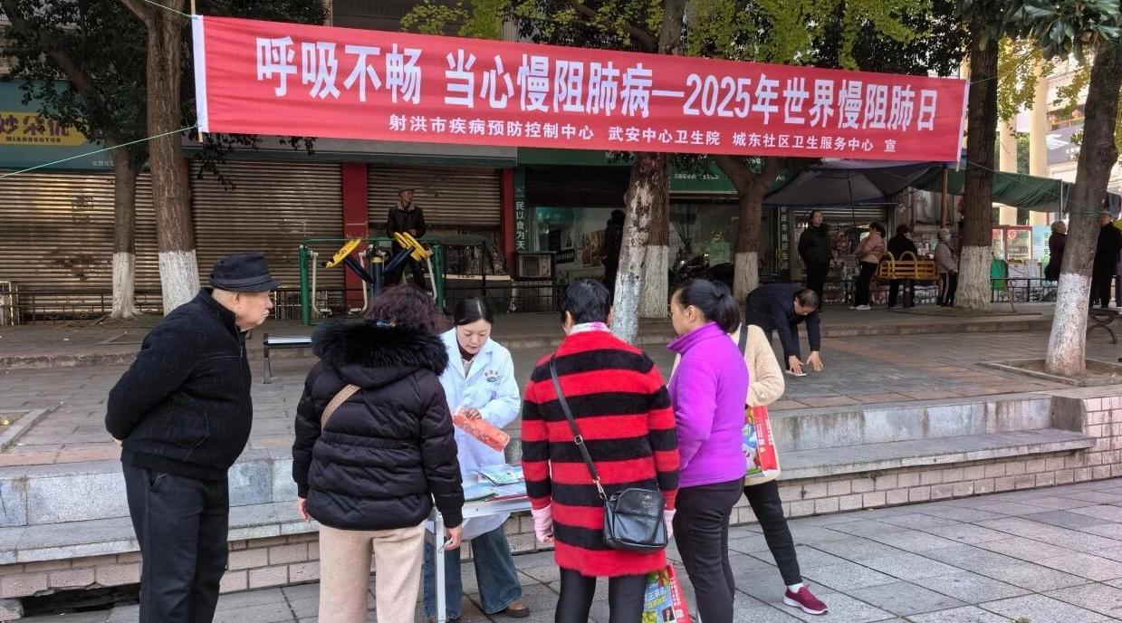 社区文化网(苏勤 李统文)为深入推进健康中国建设,加强慢性病综合防控,11月20日上午,射洪市疾病预防控制中心联合城东社区卫生服务中心、武安中心卫生院,在新世纪广场,围绕“糖尿病与幸福感”和“呼吸不畅,当心慢阻肺病”两大主题,共同开展了2025年“联合国糖尿病日”及“世界慢阻肺日”宣传咨询活动。