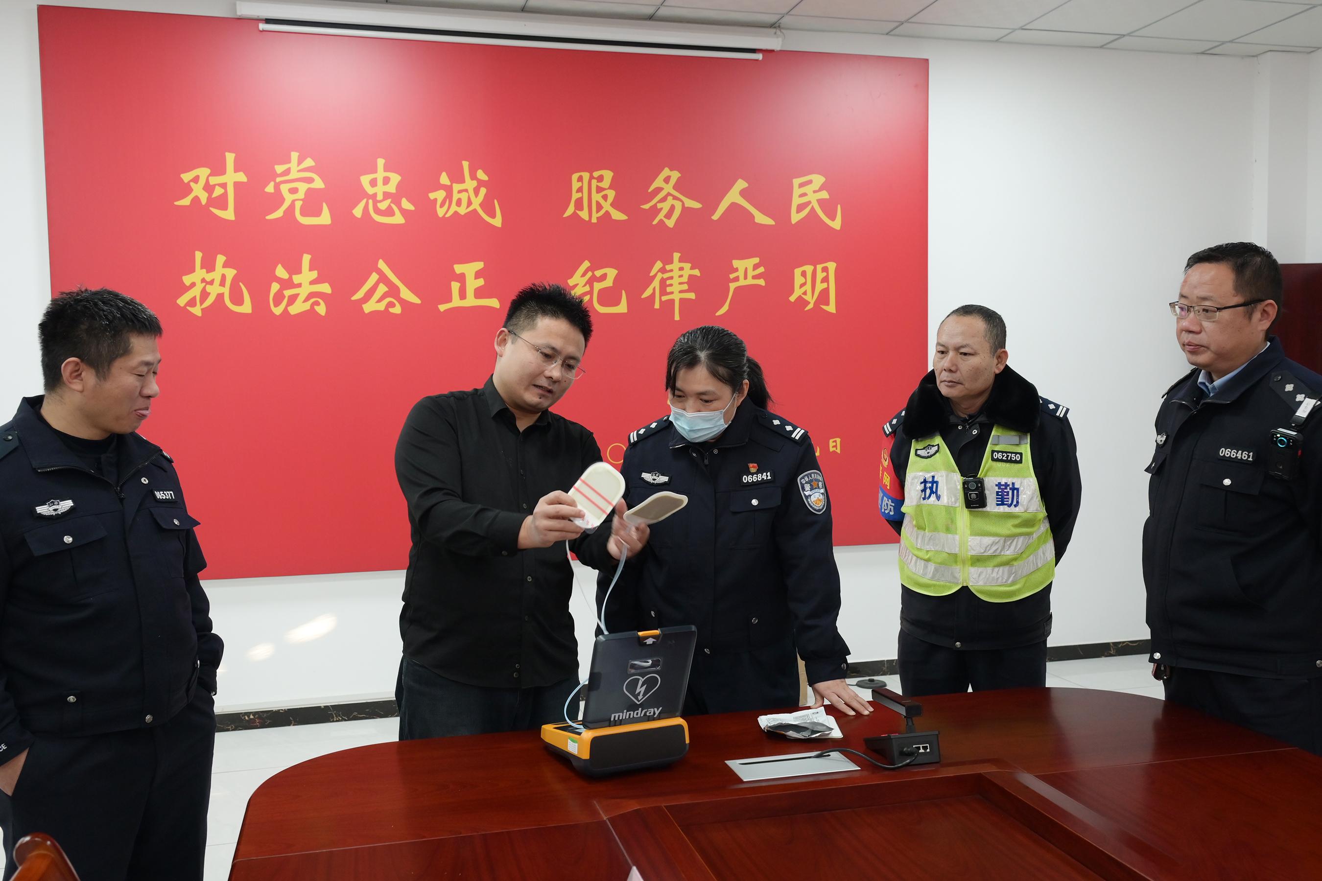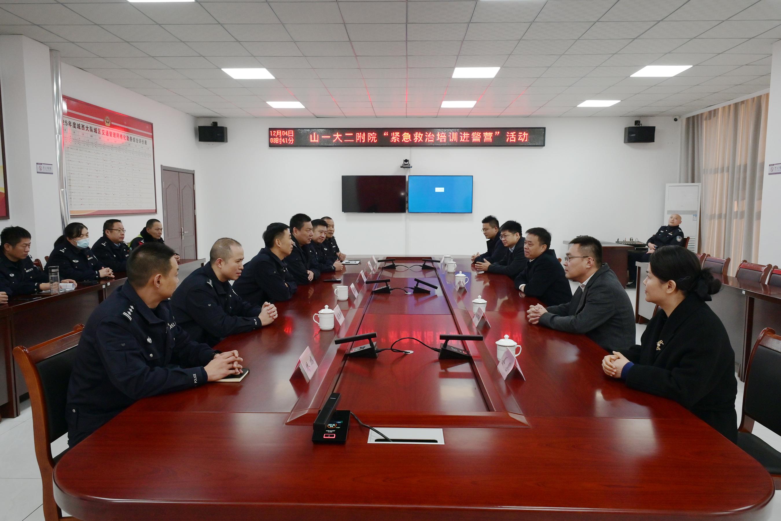 活动伊始,双方首先进行了座谈交流。交管支队政工科马磊科长、交警城西大队大队长王鑫同志对医院专家团队的到来表示热烈欢迎和衷心感谢,强调此次共建活动是推动警务实战化训练、强化为民服务本领的重要举措。房振胜副院长表示,交警同志长期奋战在道路一线,往往是突发事故现场的第一目击者和第一响应人,提升他们的急救技能,对于抢抓“黄金救援时间”、保障群众生命安全具有重要意义。座谈会上,山一大二附院还向交警城西大队捐赠了一台先进的体外自动除颤仪(AED),为大队的应急救护装备进行了重要升级。