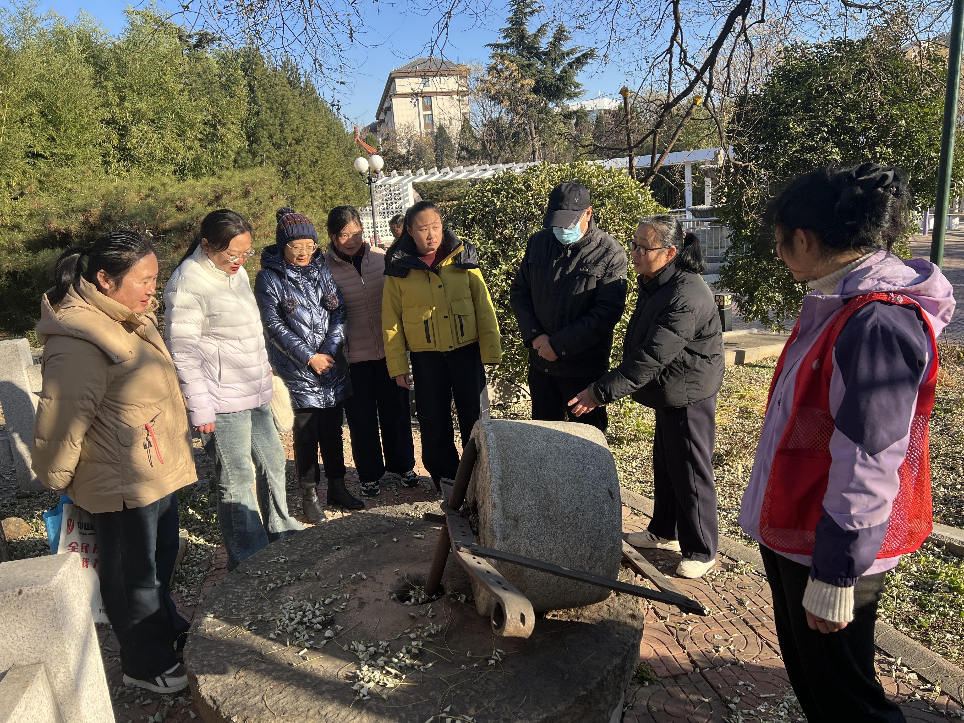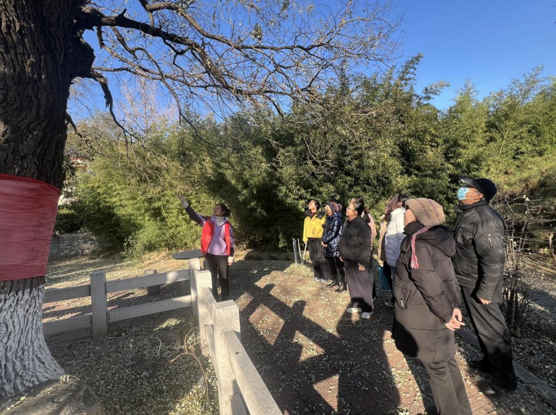 步入山东省老年大学泰山校区(傲徕峰教学点)的花园,冬日景致别有韵味。虽值寒冬,却见草木傲然挺拔,月季不畏寒风依旧盛开,于凛冽中绽放出坚韧而明媚的生命力。走进花园深处,映入眼帘的是一棵百年古槐树苍劲挺拔,枝桠交错间尽显岁月沉淀的风骨。社区科普志愿者为大家详细介绍了古树的品种、树龄及养护知识,从树干纹理到生长习性,从历史背景到生态价值,让大家在观赏美景的同时,深入了解百年古树背后的自然奥秘与人文故事。古树旁边有一座静静安卧的石碾,在志愿者的娓娓讲述中,大家了解了它往昔的来历与功用,仿佛触摸到一段沉淀在岁月里的生活记忆。