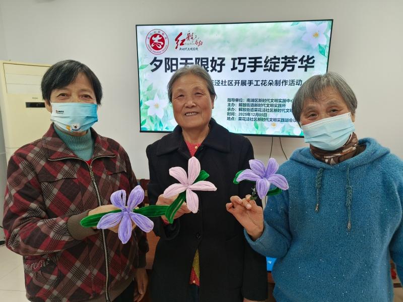 为丰富社区老年人精神文化生活,增进邻里情感联结,12月5日,嘉兴市南湖区解放街道菜花泾社区新时代文明实践站联合社区居家养老服务中心共同开展“夕阳无限好・巧手绽芳华”扭扭棒花束制作活动,吸引20余名社区长者积极参与,在指尖创意中感受手工乐趣与社区温暖。