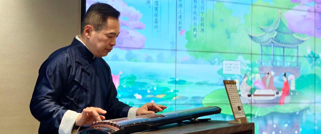 12月6日,在嘉兴市区芦席汇,人们欣赏花艺和书法、拓印作品和古琴演奏。据了解,12月6日至12月12日,在芦席汇大运河数字诗路e站南湖体验中心正在举行中国马来西亚文化交流展,来自中国和马来西亚的花艺文化大师联合展现东方文化艺术魅力。