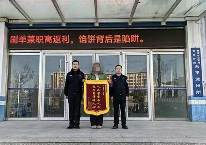 12月8日上午,史女士特意制作一面写有:“人民警察为人民 失而复得暖人心”的致谢锦旗送至天平派出所对民警的帮助表示感谢。