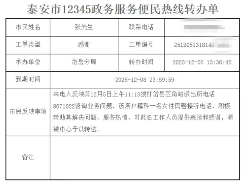 张先生前几日致电角峪派出所,咨询办理户籍业务,派出所户籍工作人员耐心解答张先生问题,认真负责告知张先生办理业务需要的材料,以优质的服务态度赢得群众好评,为表达谢意,张先生特意拨打12345,对角峪派出所户籍工作人员表示感谢。