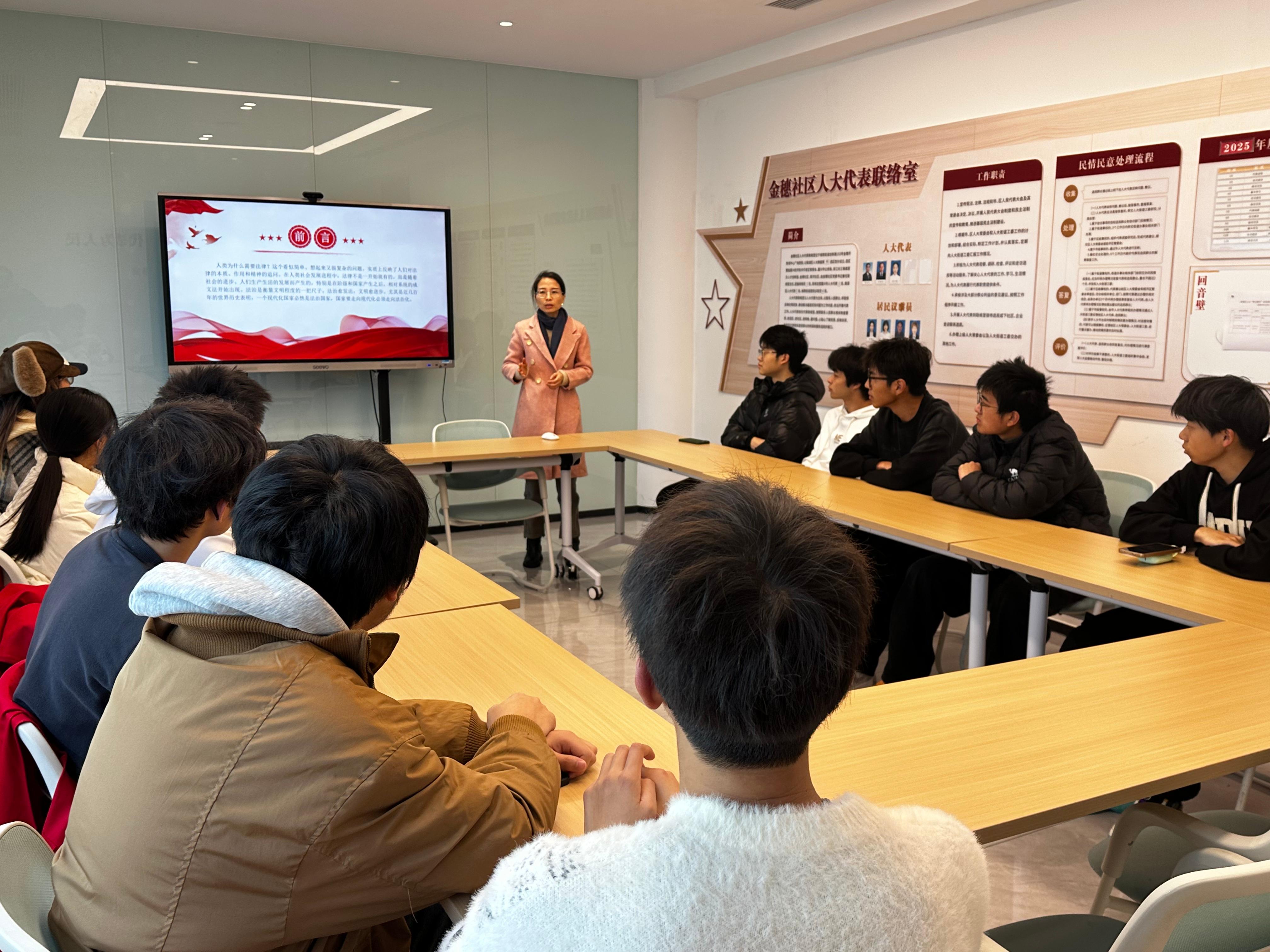 活动当天,社区首先组织了一场面向社区青年大学生的普法专题讲座。 工作人员结合在校学生的日常生活案例,深入浅出地讲解了宪法的地位、作用以及公民的基本权利与义务。讲座现场互动频频,青年听众们就关心的法律问题踊跃提问,志愿者一一耐心解答。这场讲座不仅提升了社区青年的法律素养,更激发了大家参与法治社区建设的热情。