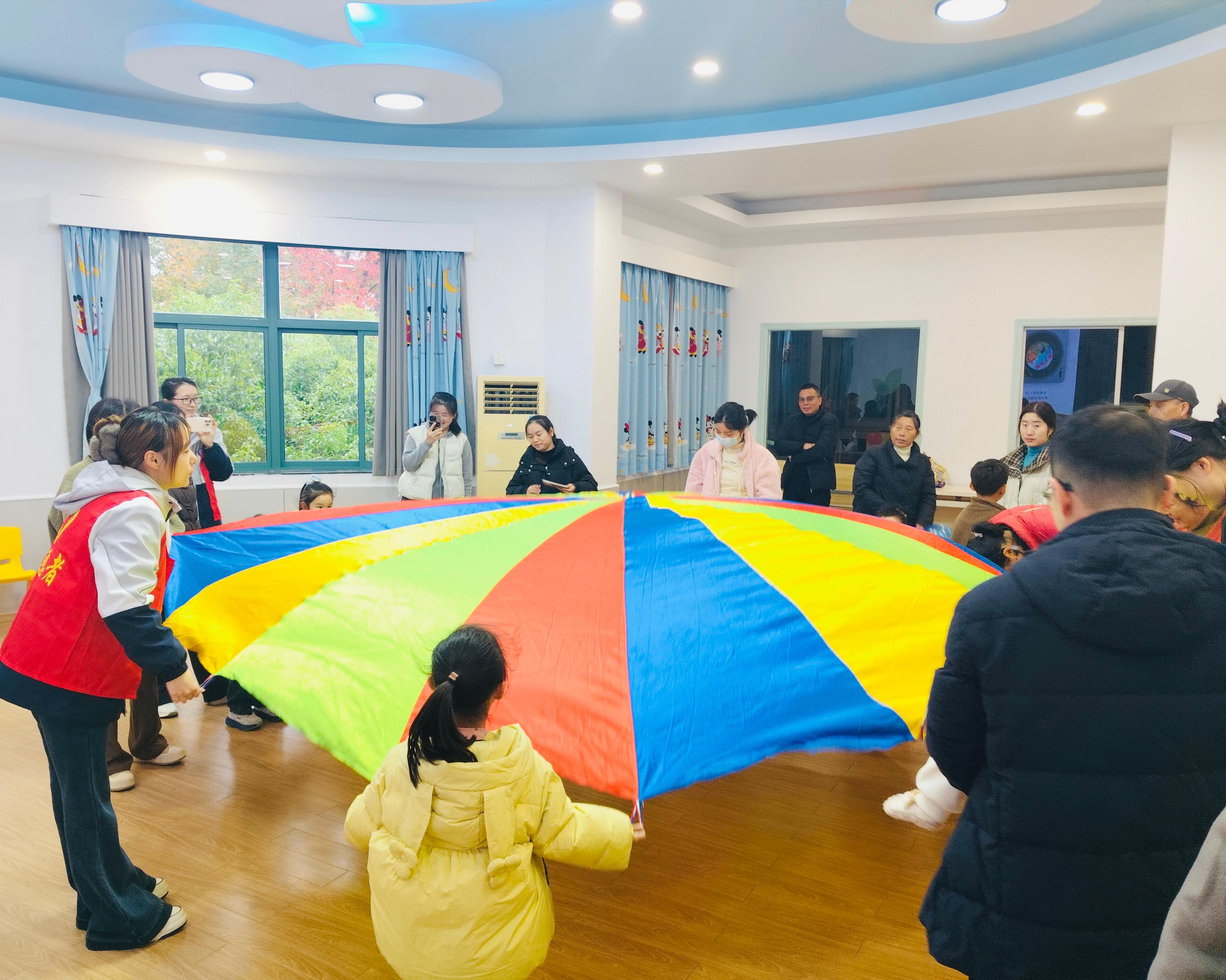 随后,彩虹伞亲子游戏环节点燃现场氛围。首先是“彩虹伞见面会”,教师手持色彩斑斓的彩虹伞,引导家长和孩子触摸伞面、认识颜色。“风来啦!”随着教师指令,“小风吹”时,家长们轻轻抖动彩虹伞,伞面如波浪般缓缓起伏;“大风吹”时,抖动速度加快,五彩伞面翻飞,孩子们在伞下欢呼奔跑;“龙卷风”指令响起,家长们牵着伞边快速旋转,彩虹伞形成绚烂漩涡,现场笑声不断。“好久没这么尽兴地陪孩子玩了,看着他在伞下笑得那么开心,我也跟着乐呵。” 一位妈妈笑着说道。