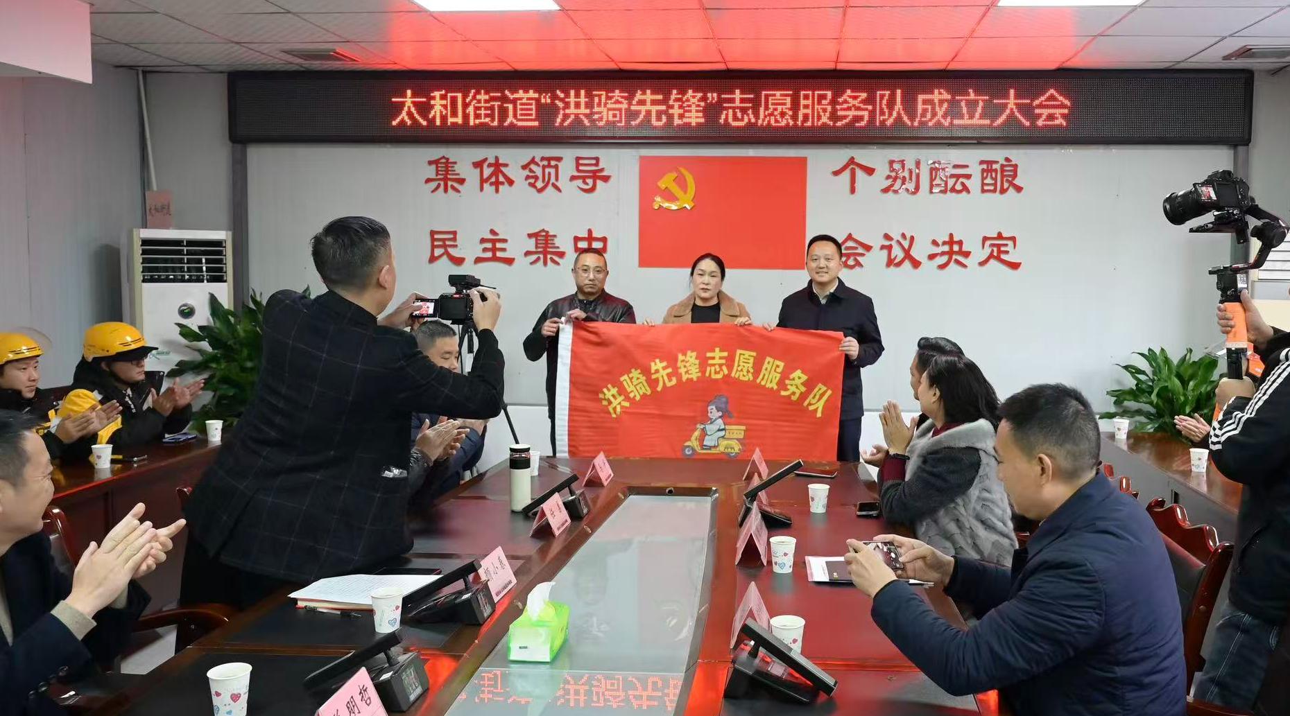 成立大会上,射洪市委社会工作部部长兰明哲为志愿者代表赵海霞授牌,太和街道相关负责人宣读了成立批复文件、向队伍授旗。