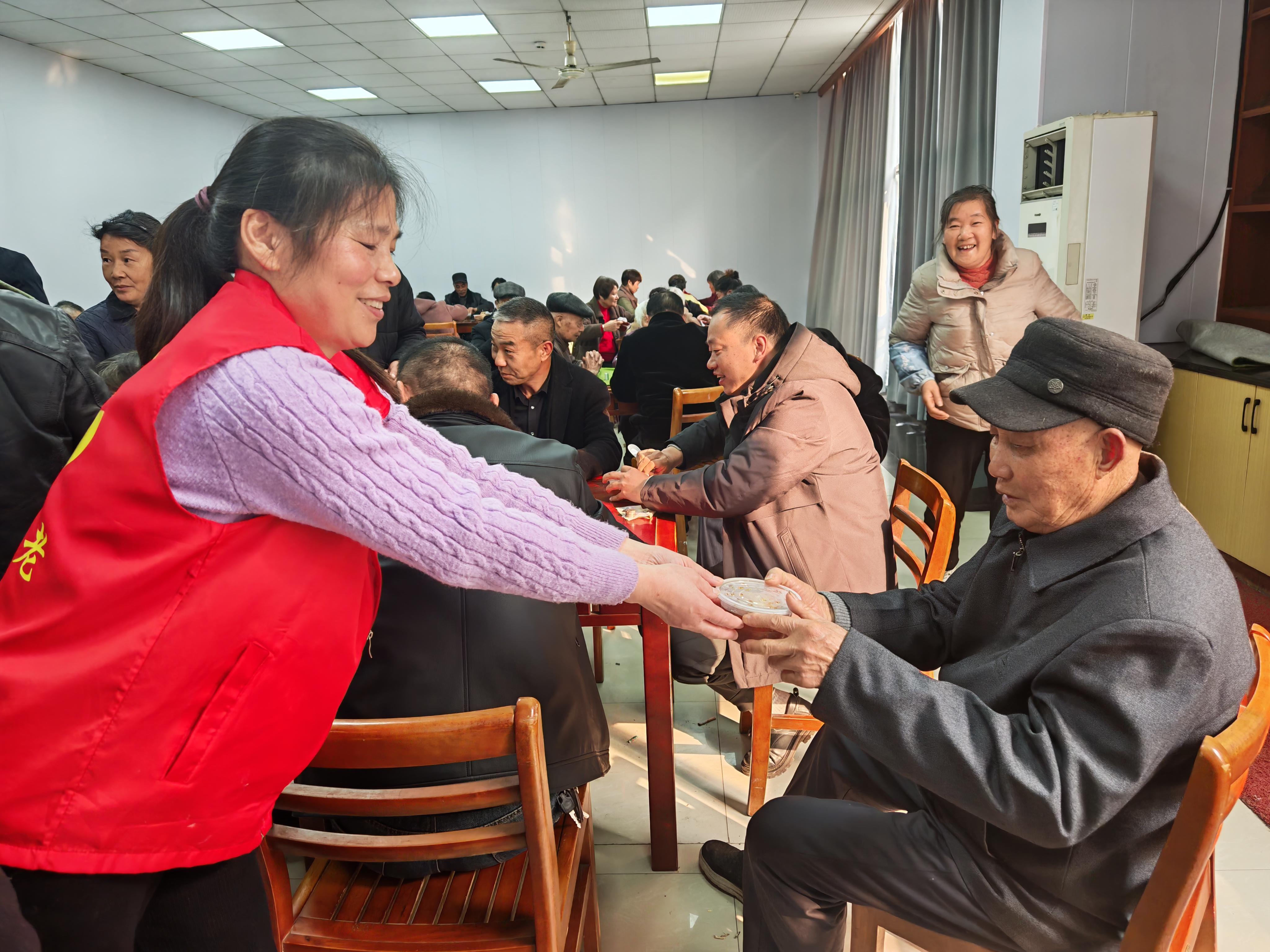 暖心美食,品味传统。当天上午,工作人员就开始准备食材,桂圆、鸡蛋、冰糖……每一种食材都经过精心挑选。在烧制过程中,工作人员手法娴熟,不一会儿,一碗碗香气扑鼻的桂圆烧蛋便出炉了。趁着中场休息期间,手捧热气腾腾的桂圆烧蛋穿梭在观众席间,一颗颗饱满的桂圆和鸡蛋,不仅驱散了冬日寒气,更让老人们尝到了“冬至大如年”的传统味道。