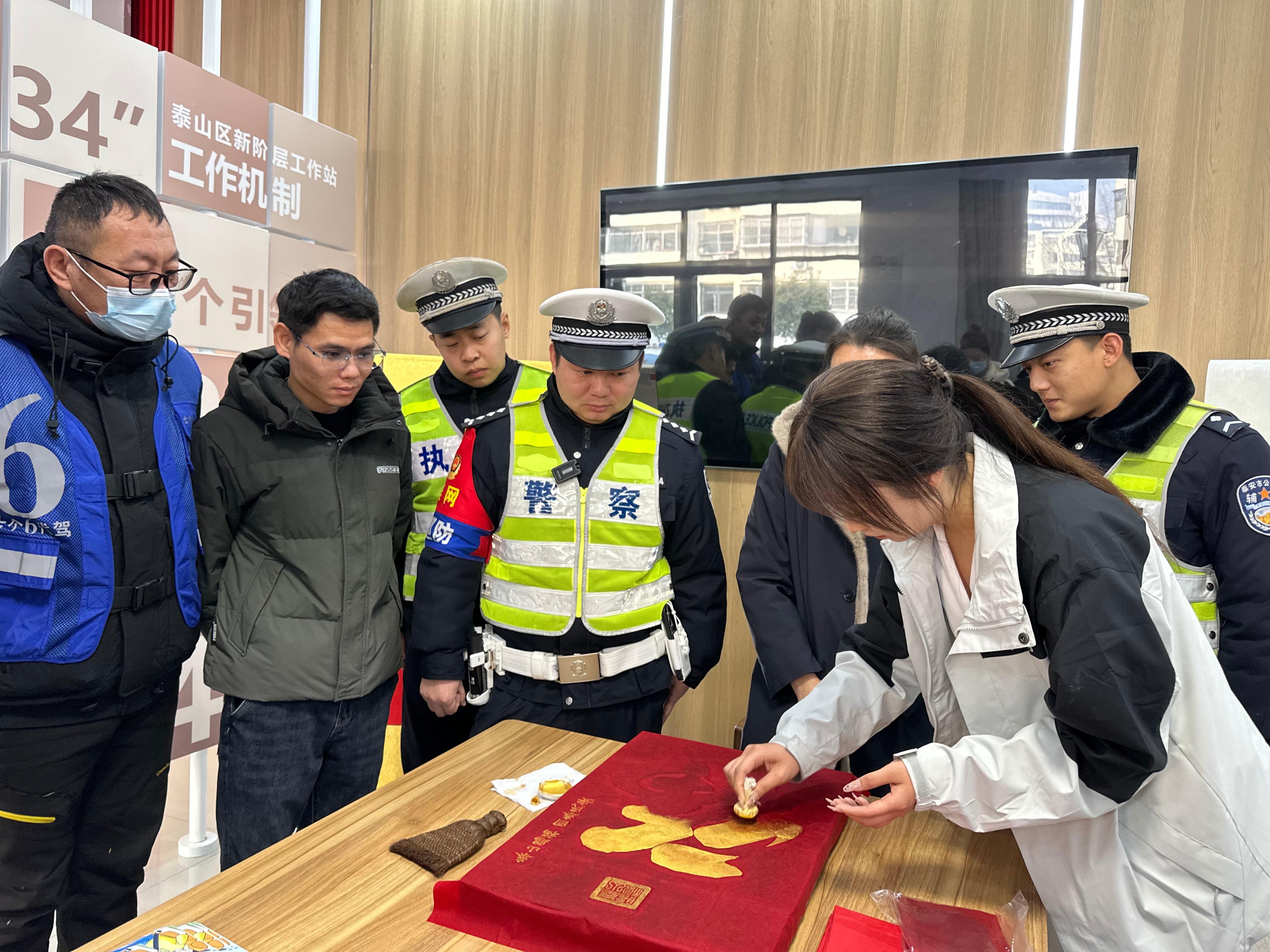 活动特别邀请了泰山拓片非遗传承人现场展示技艺。拓印老师精心制作了融合交通元素的“泰山第一福”拓片,墨色斑驳的“平安是福”字样与交通标志相映成趣。“平安出行就是最大的福气”,通过这一创新的艺术形式,交通安全理念以温情的方式深入民心。