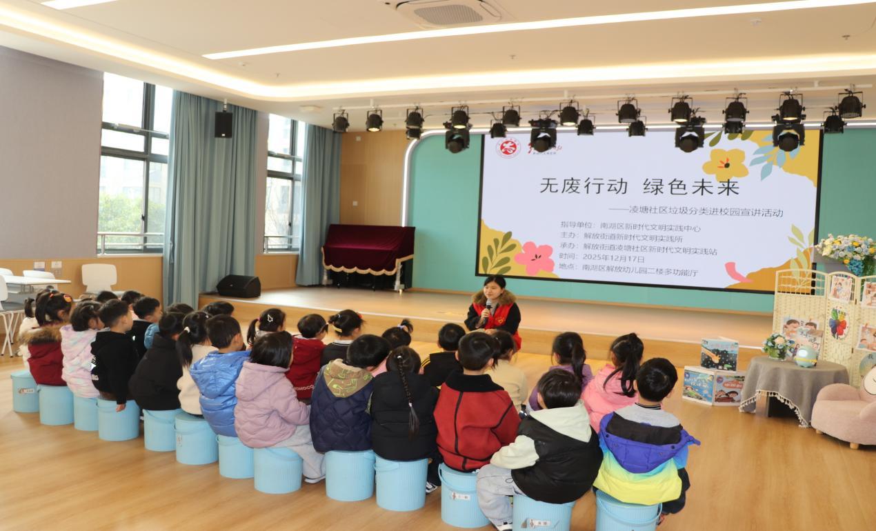 12月17日上午,嘉兴市南湖区解放街道凌塘社区新时代文明实践站携手解放幼儿园,开展“无废行动,绿色未来”垃圾分类主题宣传活动,20余名师生齐聚一堂,在趣味互动中解锁环保新知识。