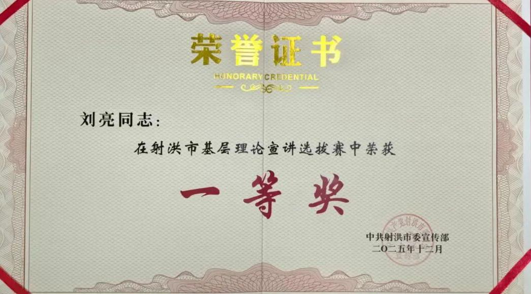 社区文化网(苏勤 李统文)12月18日,射洪市 “奋进‘十五五’ 谱写新篇章” 基层理论宣讲选拔赛决赛圆满落幕,射洪市中医院职工刘亮凭借优异表现荣获一等奖。