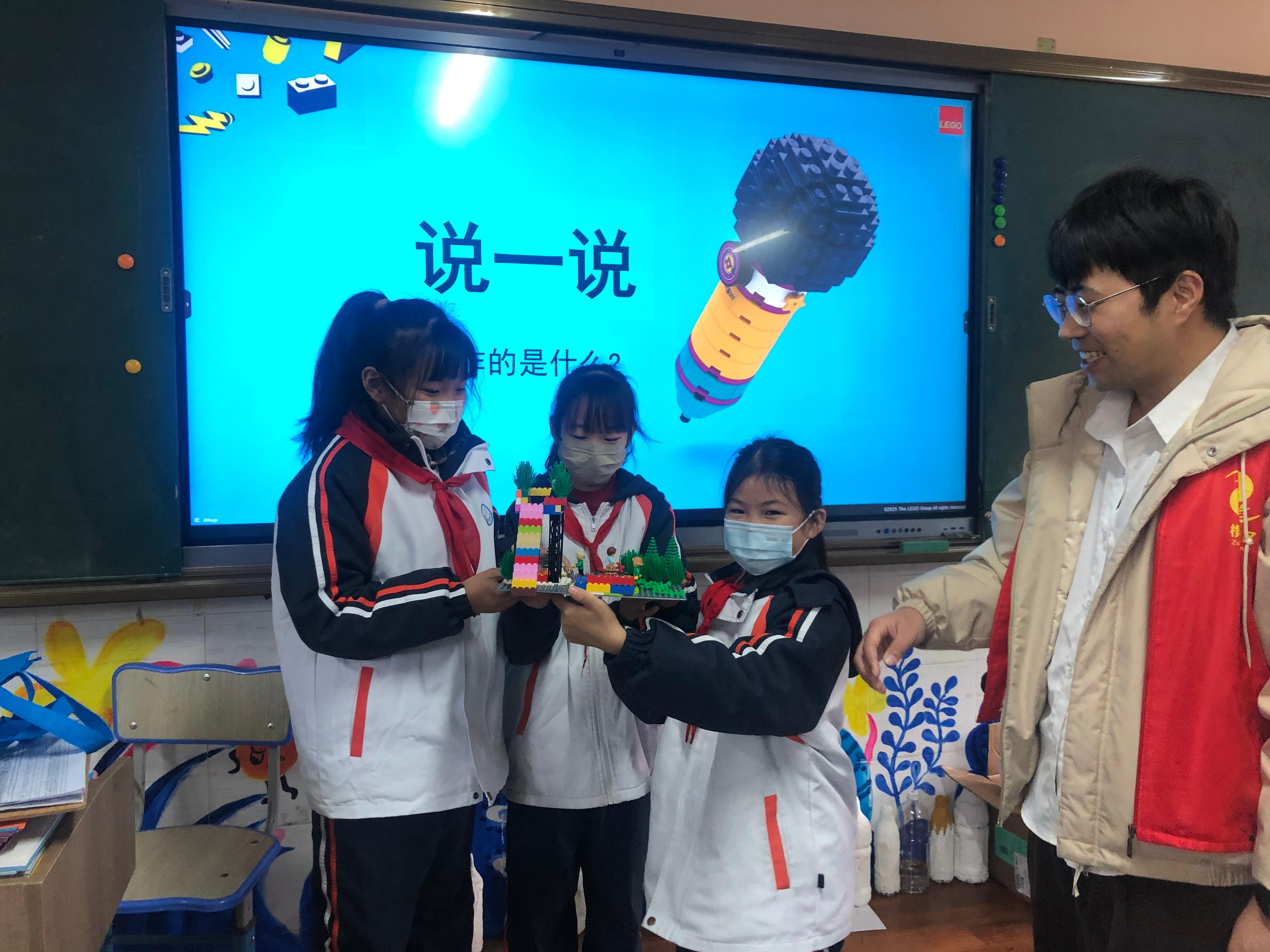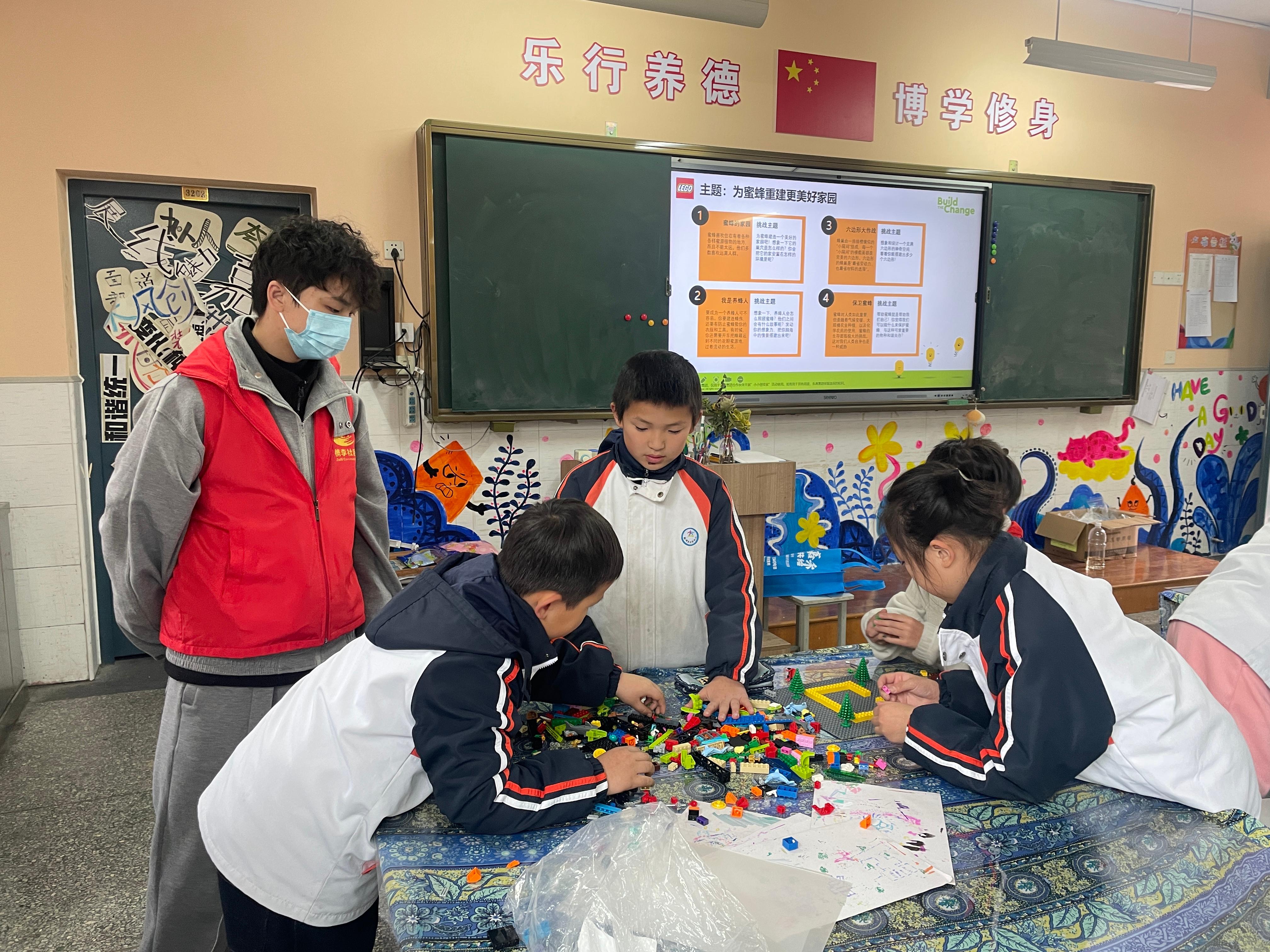 科普结束后,乐高搭建环节如期开启。孩子们化身“小小设计师”,与同学们分工协作,用积木搭建动物家园:孔雀主题有鲜花花园与警示标识,蜜蜂主题有蜂巢与花海,藏羚羊主题有高原草原与保护站,每一份作品都承载着守护心意。