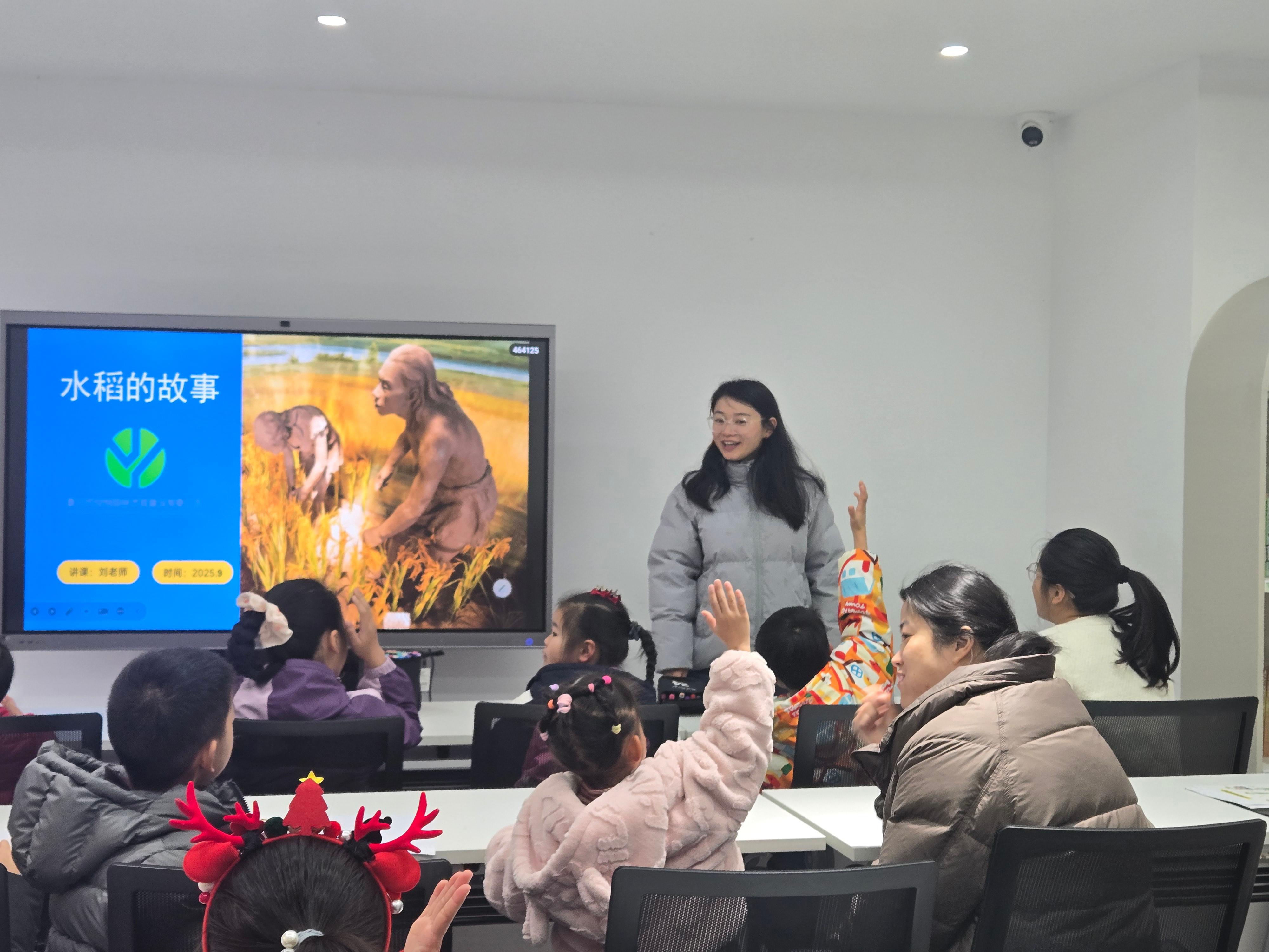 活动伊始,蔬彩园的专业老师带来了生动有趣的水稻知识讲座。老师用通俗易懂的语言,配合精心准备的图片和实物标本,从水稻的起源讲起,详细介绍了“种子发芽—培育秧苗—移栽大田—抽穗扬花—成熟收割—加工成米”的完整生长周期。孩子们瞪大好奇的眼睛,认真聆听水稻如何在阳光雨露中扎根生长,在农民伯伯的悉心照料下褪去青衫、换上金袍。互动环节中,小朋友们踊跃提问,“水稻为什么长在水里?”“糙米和白米有什么区别?”老师一一耐心解答,现场氛围热烈。