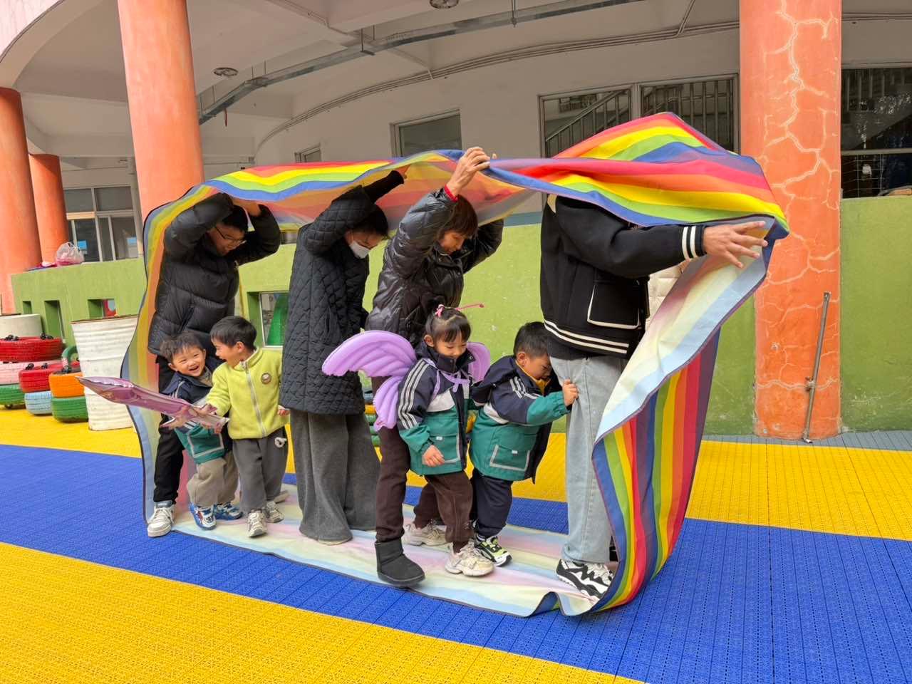 亲子运动区亮点纷呈:小飞侠、无敌风火轮、稳步前进等项目考验着亲子之间的默契。孩子们或在家长牵引下如小鸟般“飞翔”,或携手灵活穿越轮胎阵,每完成一项任务即可收集印章,兑换精美礼品。团体赛中,穿越彩虹桥项目由家长们搭起坚实的“人桥”,助孩子们顺利通行;拔河比赛更是将气氛推向高潮,各班家长组队较量,呐喊声、助威声此起彼伏,洋溢着团结与激情。