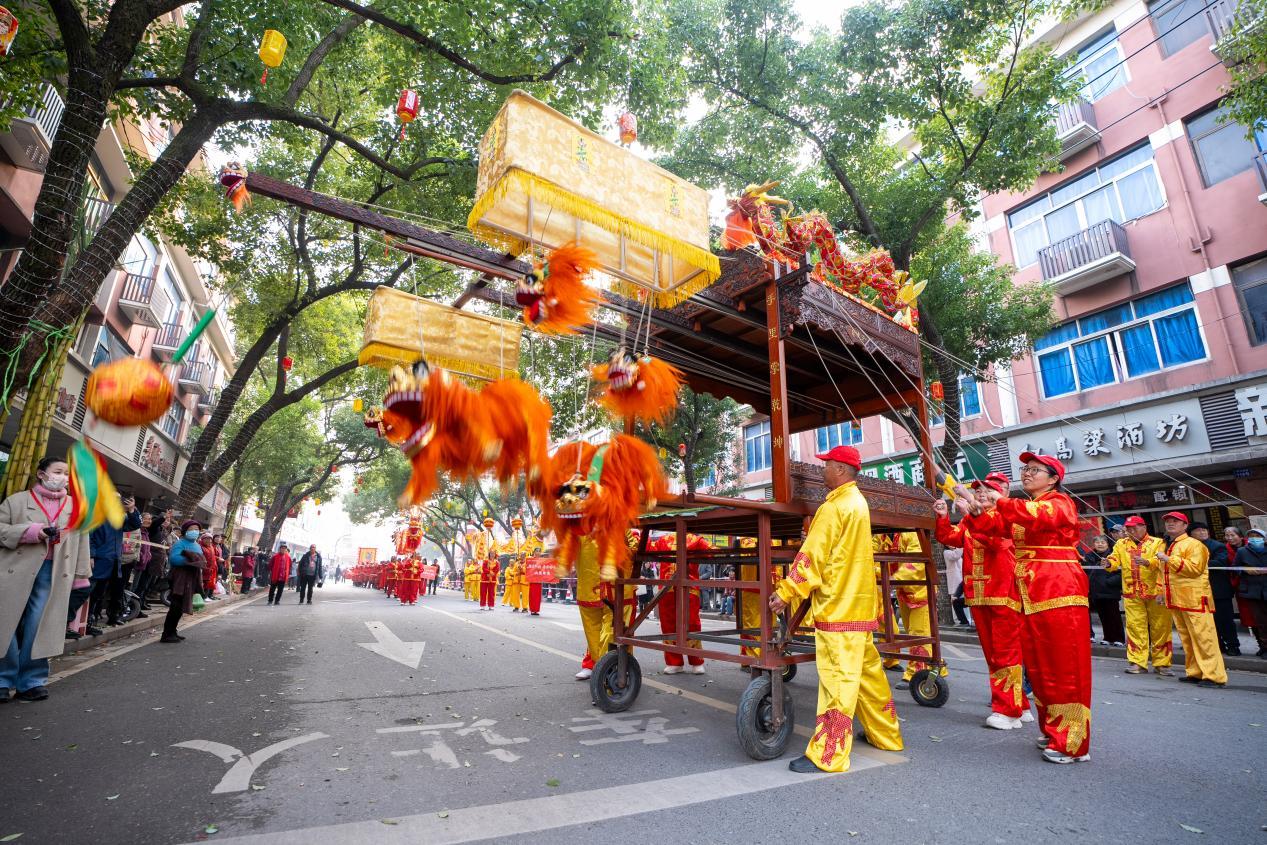 一路上,戚家军义乌兵、拉线狮子、舞龙、十八担、道情等十余项非遗项目轮番上演,令人目不暇接。许多人不自觉地跟着队伍走了起来,频频用手机记录下“家门口的热闹”,并将这份喜悦通过社交网络实时分享。周边的商户也纷纷借此机会展示特色产品,共享文化带来的蓬勃生气。