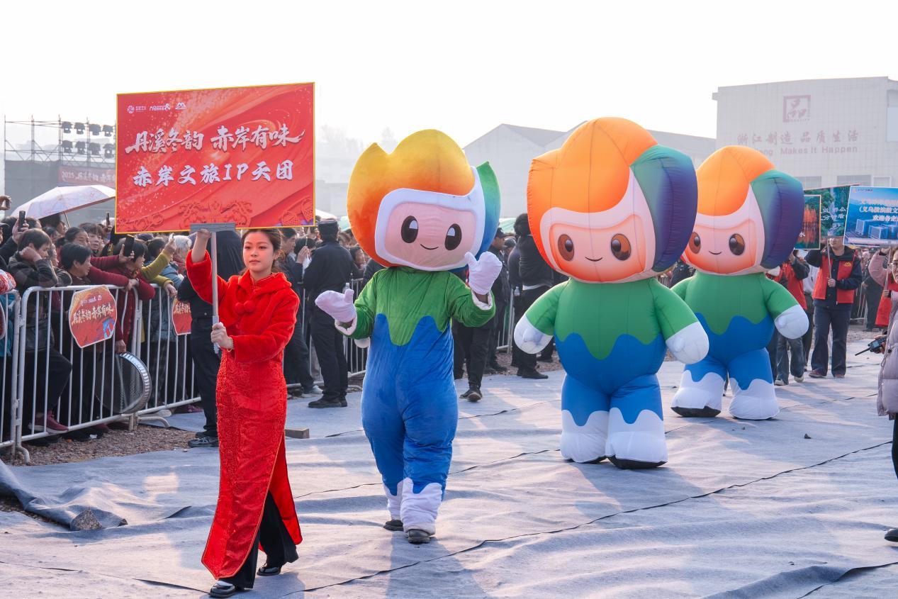 下午三点,铿锵锣鼓准时擂响,踩街队伍浩荡出发。赤岸镇文旅IP“安安”率先开路,紧随其后的,是由民间传说中的花神与财神共同组成的“NPC天团”,他们与路边的居民亲切互动,派发福气,成为本次巡游中一道亮丽风景。