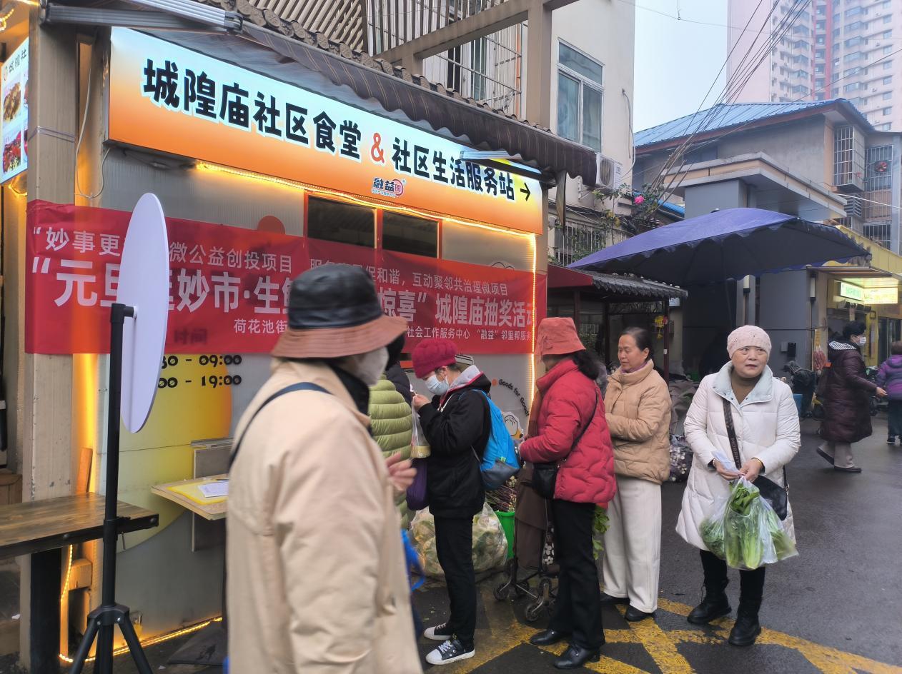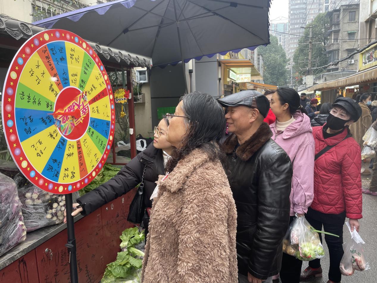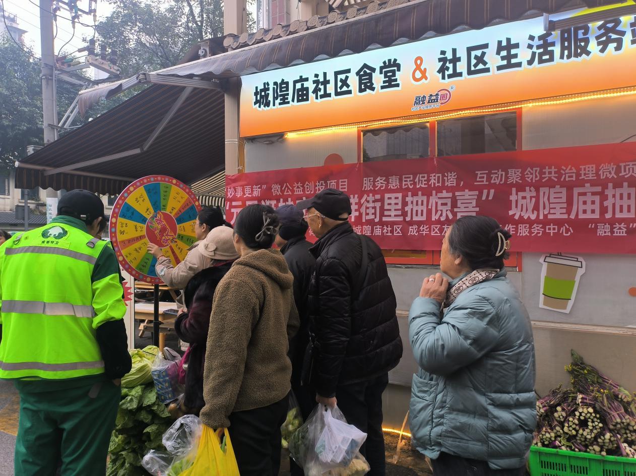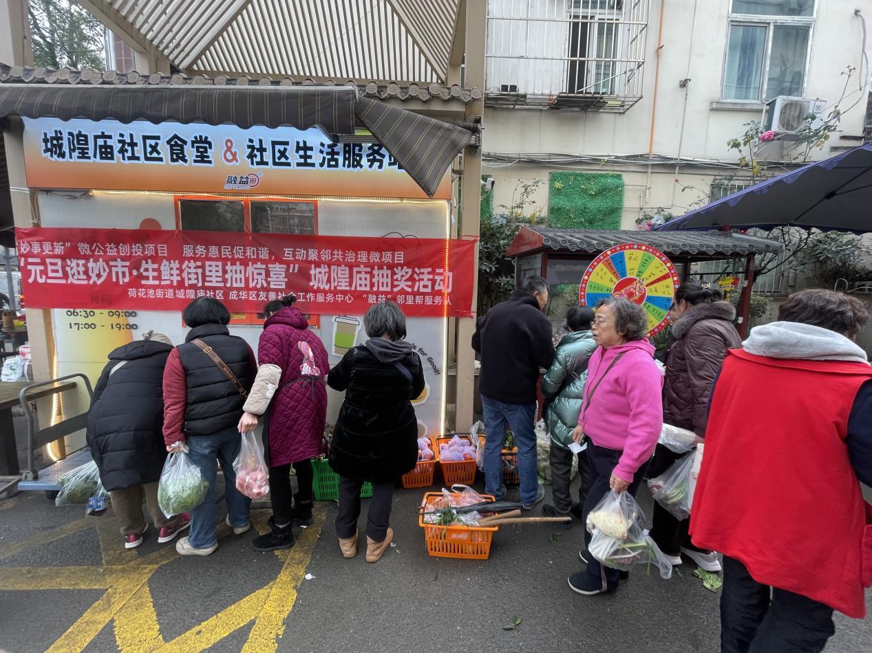 岁末迎新,福暖邻里。2025年12月31日,由成都市荷花池街道城隍庙社区牵头,联合成华区友善社会工作服务中心、“融益”邻里帮服务队共同主办的“元旦逛妙市・生鲜街里抽惊喜”抽奖活动在城隍妙市热闹开启。活动以新鲜蔬果为奖品,采用幸运转盘互动形式搭建邻里欢乐平台,让辖区居民在趣味转动中收获惊喜,在欢声笑语中迎接新年到来,共绘和谐社区新图景。
