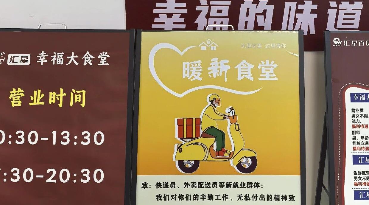 搭建“一处暖新平价食堂”。充分发挥职能优势,推动汇星百货五楼幸福大食堂为骑手提供优惠服务。食堂严格把控餐食质量与卫生标准,推出价格亲民、营养均衡、出餐快速的平价餐品,让骑手既能吃得安心、吃得实惠,以暖心餐食筑牢服务保障底线。