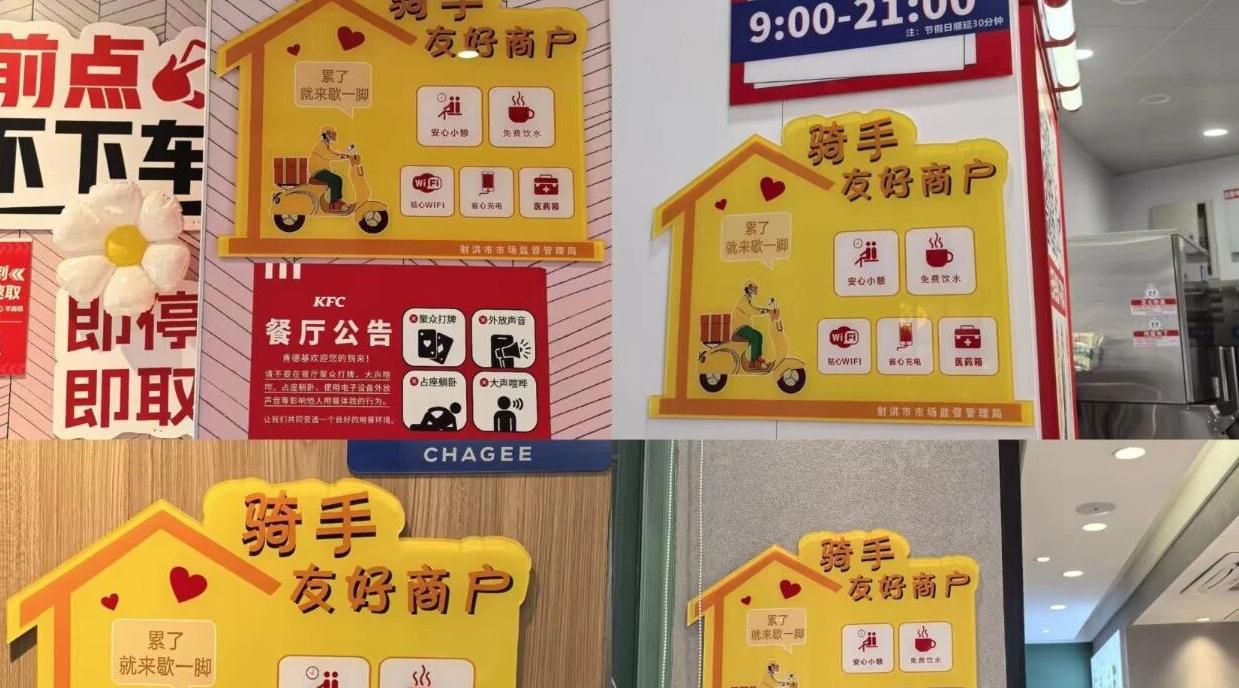 培育“一批骑手友好商户”。广泛发动商圈内优质商户参与,筛选出一批服务规范、意愿强烈的商户授牌为“骑手友好商户”。商户均在门店醒目位置张贴统一设计的标识,设立专用取餐台或指定取餐区域,提供免费饮水、临时歇脚地等应急便利服务。以商户联盟的形式,在商圈内营造起尊重、理解、关爱骑手群体的浓厚氛围。