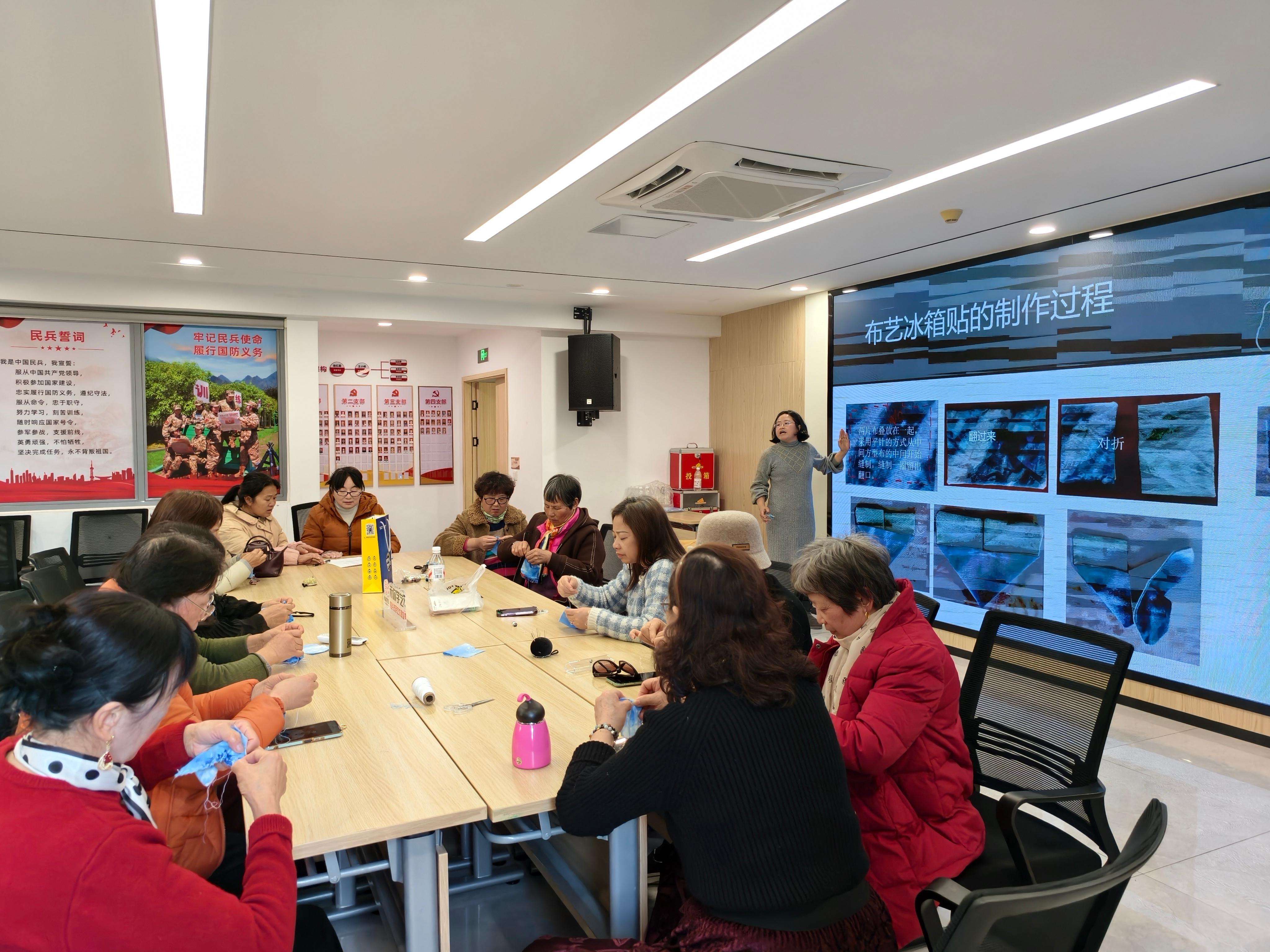 为丰富辖区居民精神文化生活,传承非遗手工艺魅力,搭建邻里交流互动平台,近日,嘉兴经开区城南街道文博社区联合嘉兴大学设计学院、浙江长护健康养老有限公司,特邀学院于老师开展蓝印花布手工冰箱贴制作活动。20 余名居民欢聚一堂,在一针一线、一剪一粘间,沉浸式体验手工创作的乐趣。