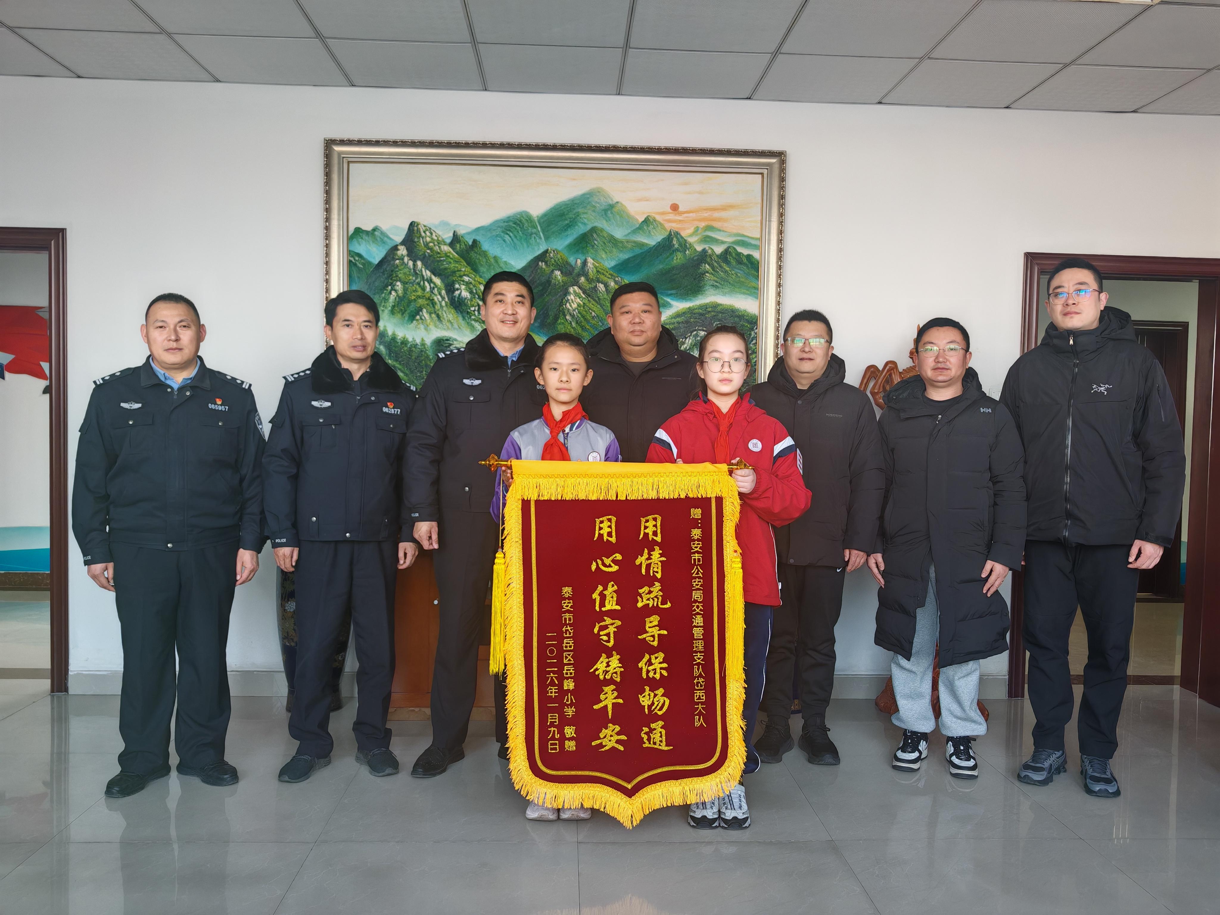 社区文化网(通讯员 黄美弟)2026年1月9日,在全国第6个“人民警察节”到来之际,岳峰小学师生代表将一面印有“用情疏导保畅通 用心值守铸平安”字样的锦旗送到泰安交警岱西大队,对近年来护学岗民警风雨无阻,持之以恒地守护师生安全,维护校园周边道路交通安全表示由衷的感谢。