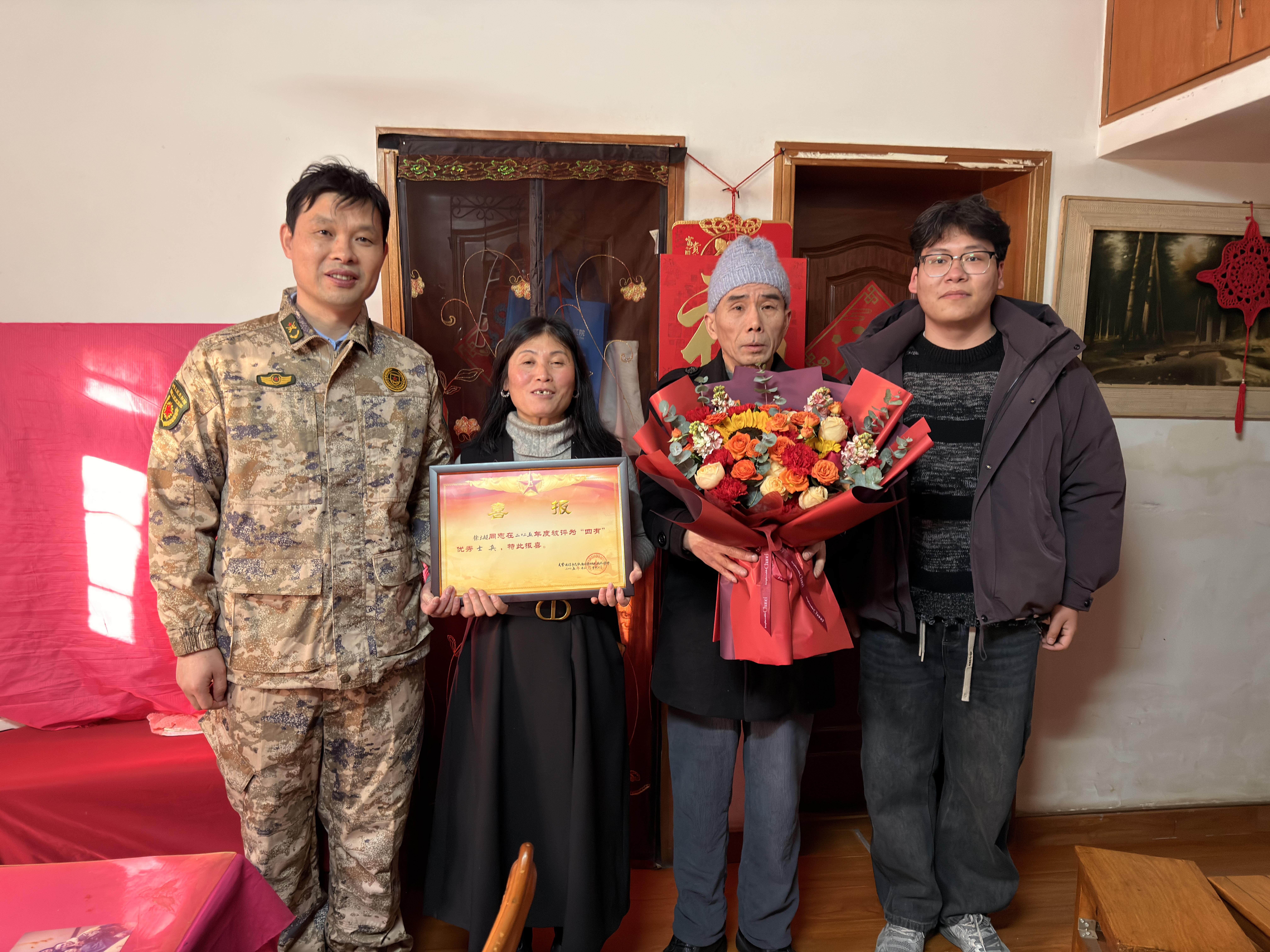为进一步弘扬拥军优属光荣传统,营造“一人参军、全家光荣”的浓厚社会氛围,1月9日下午,嘉兴市南湖区新嘉街道人武部部长陈军与栅堰社区同志一行,共同前往现役军人徐云超同志家中,为其家属送上荣获“四有”优秀士兵的喜报,传递党和政府对军人军属的关怀与温暖。
