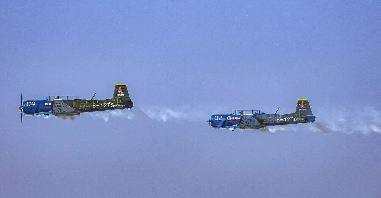 30度角俯冲增速、垂直拉起跃升、大速度通场、双圈螺旋精准改出、横“8”字飞行、半斤斗翻转着陆……上月,东阳横店通用机场,两架蓝绿拼色的初教-6飞机引擎轰鸣,上演了一场“蓝天特技秀”。