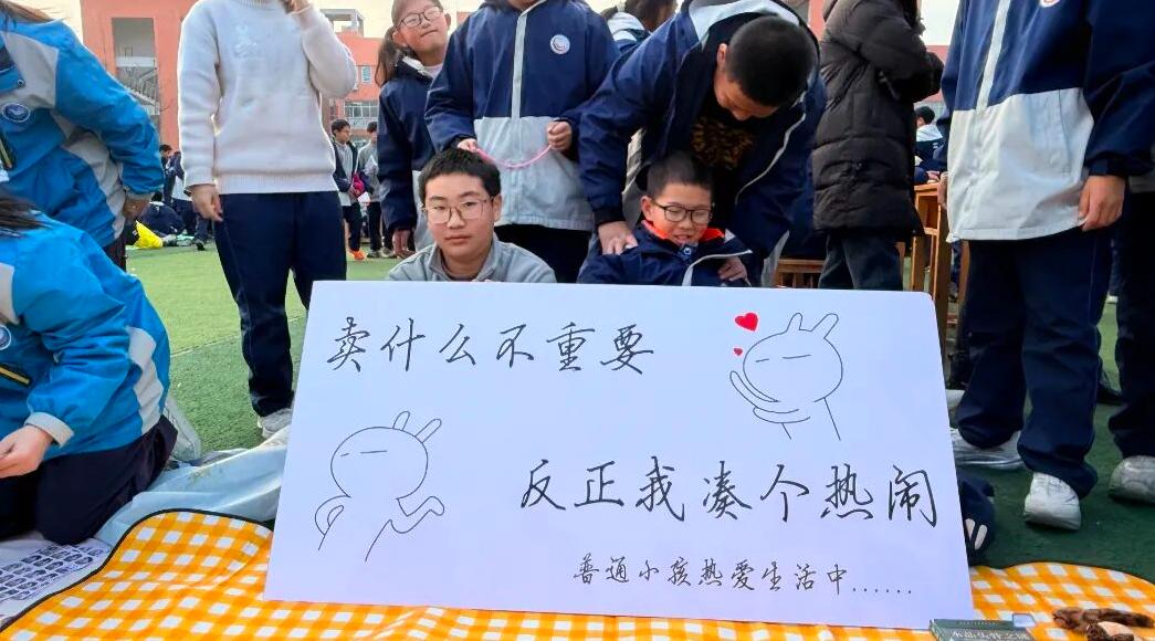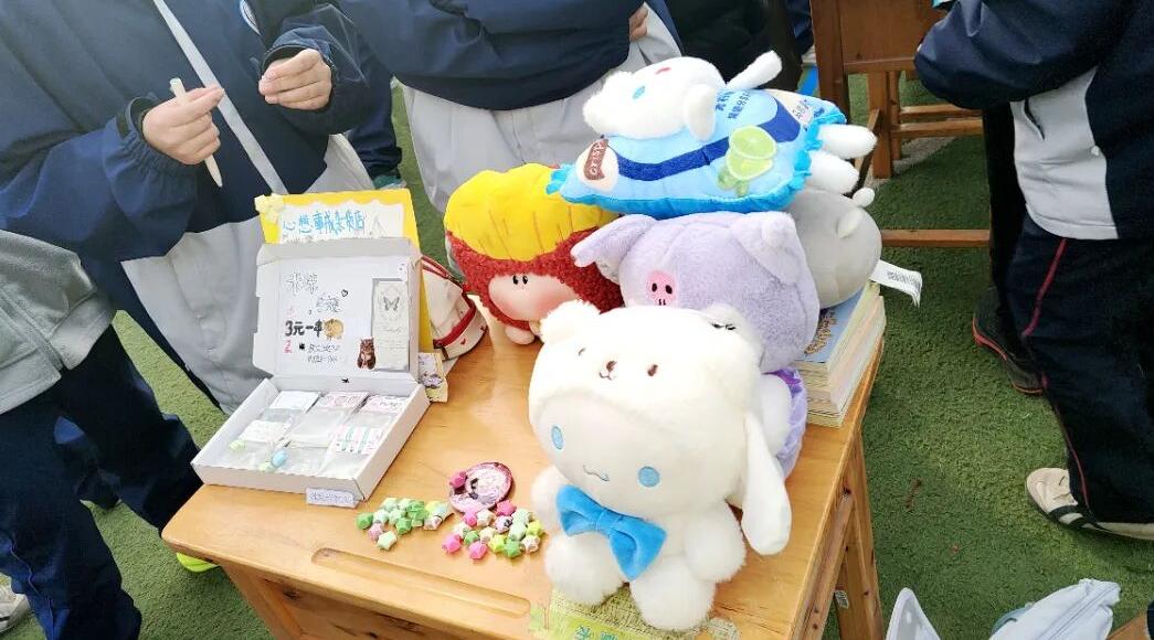 活动现场热闹非凡,外操场被一个个创意十足的摊位装点成欢乐集市。“阳光杂货铺”“童心藏宝阁”“脑洞小集市”……手绘海报上的俏皮标语格外吸睛,毛绒玩具、童话绘本、手工挂件、闲置文具整齐陈列,每一件物品都藏着小主人的珍视与期待。小摊主们各显神通,有的热情吆喝招揽顾客,有的耐心介绍商品亮点,有的巧用“买一送一”“限时特惠”的促销妙招,认真记账、礼貌找零的模样,尽显“小老板”的担当与风采 。