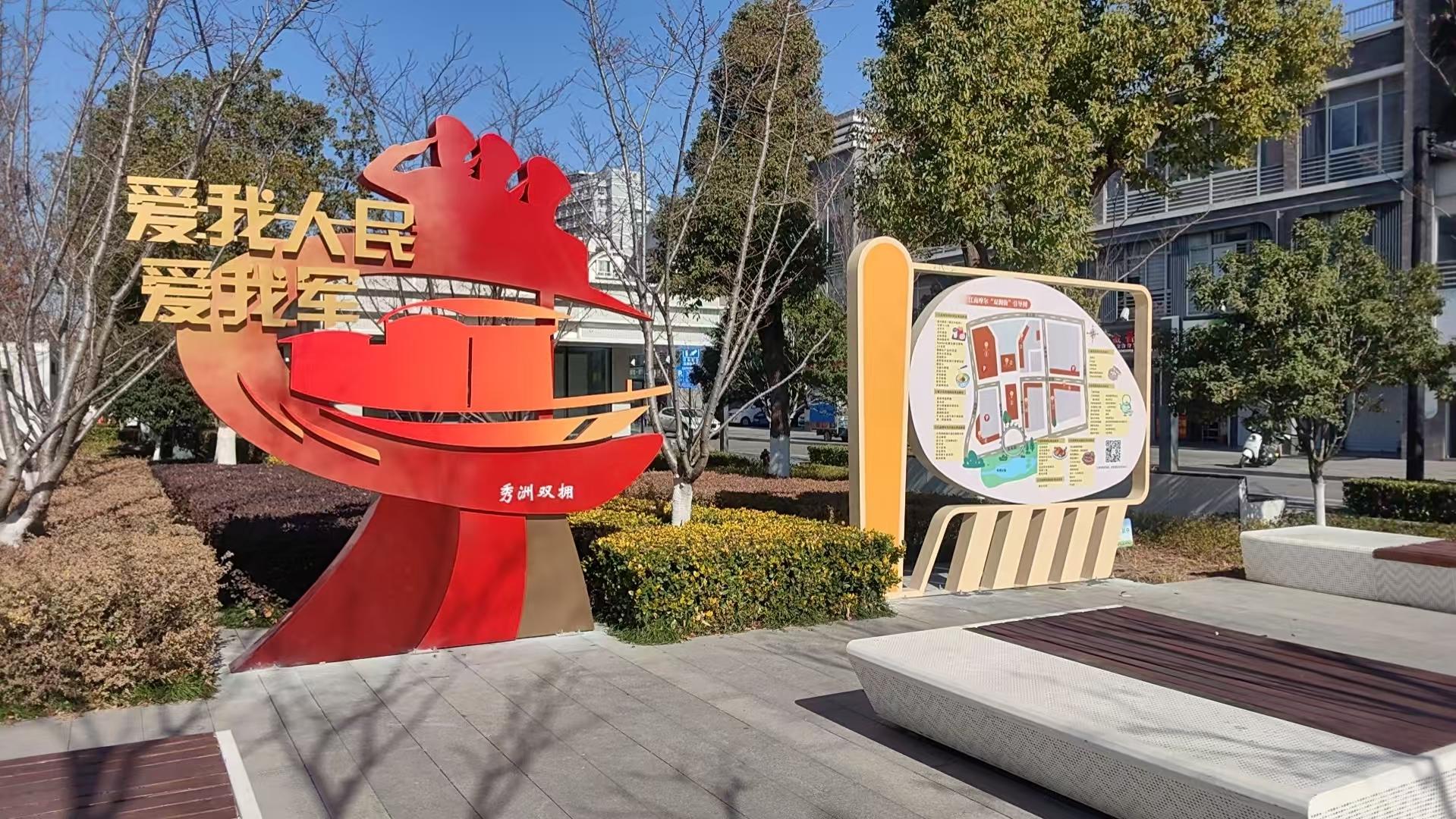 站在摩尔东街西侧的广场上,新设立的双拥主题标志格外引人注目。整个标志将红船、海浪和军人敬礼的图案巧妙融合,以“军耀南湖、秀洲有礼”为主题。红船象征着不变的初心,海浪展现着军人勇往直前的精神。标志上,“爱我人民爱我军”的黄色大字与“秀洲双拥”的白色字样相互映衬,成为街边一道温暖而有力的风景。