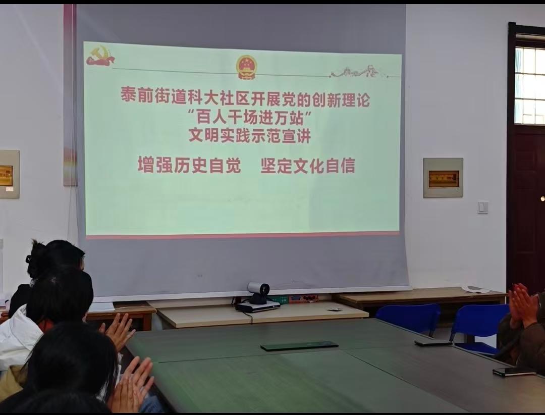 【培育和践行社会主义核心价值观】 增强历史自觉 坚定文化自信 ——泰安市泰前街道科大社区开展党的创新理论“百人千场进万站”文明实践示范宣讲