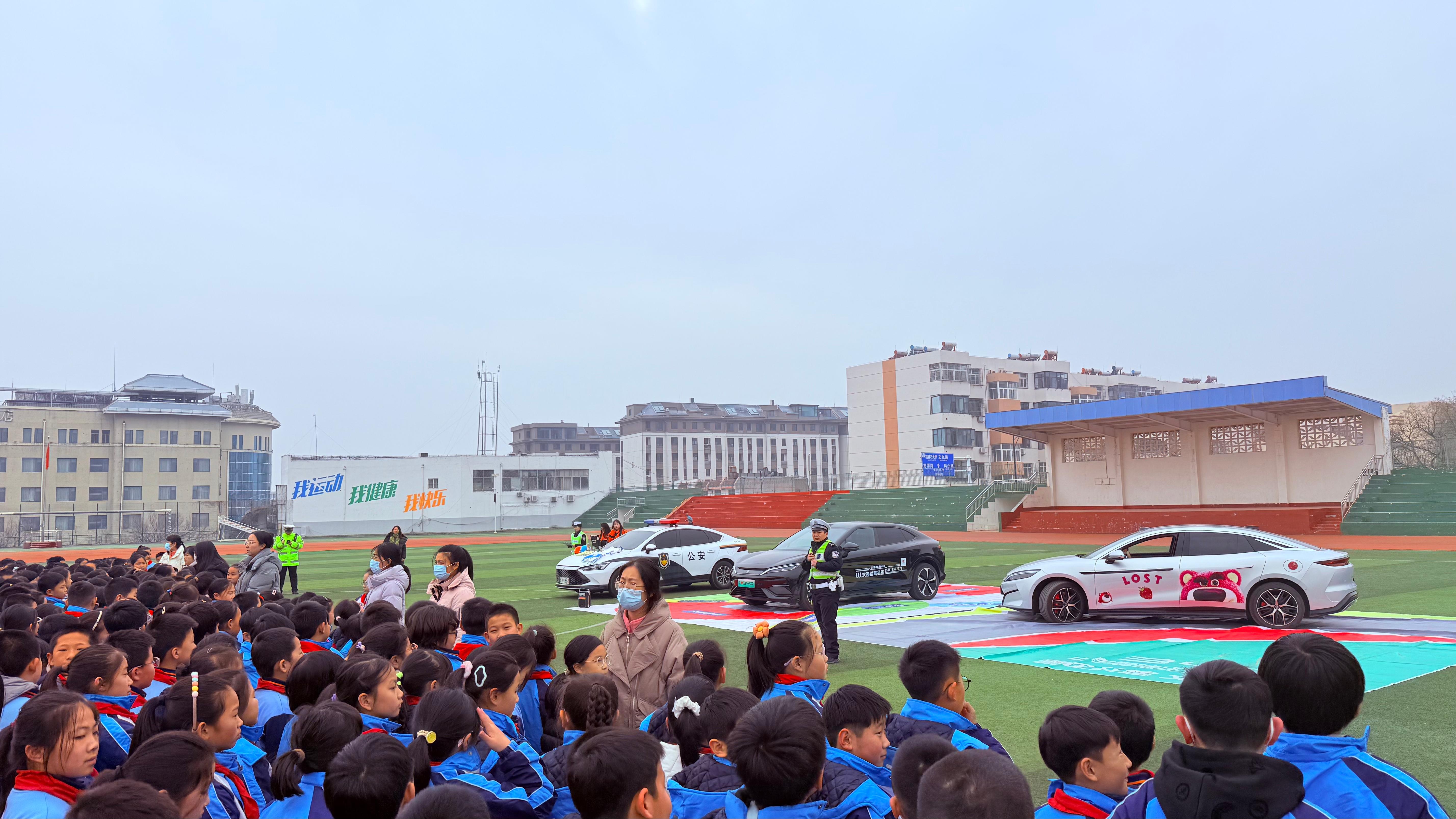 在“车辆盲区实景认知区”,由泰安震德比亚迪提供的演示车辆成为最直观的教具。民警现场标注出车辆前后方及A/B/C柱侧方等视觉盲区,生动讲解其危险性。学生们轮流坐上驾驶位,亲身感受司机视角的局限,不禁感叹:“原来车旁有人,车里真的看不见!”