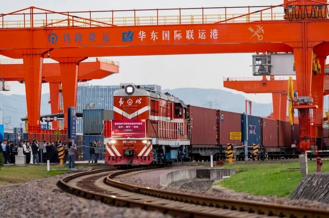 向西,浙江中欧班列(义新欧)依陆出境。金华(义乌)获批成为全国14个中欧班列集结中心之一,浙江中欧班列完成双平台融合,开通26条运行线路,辐射亚欧大陆50多个国家、160余座城市,2025年开行量突破3000列(折算列)大关,同比增长14.8%。