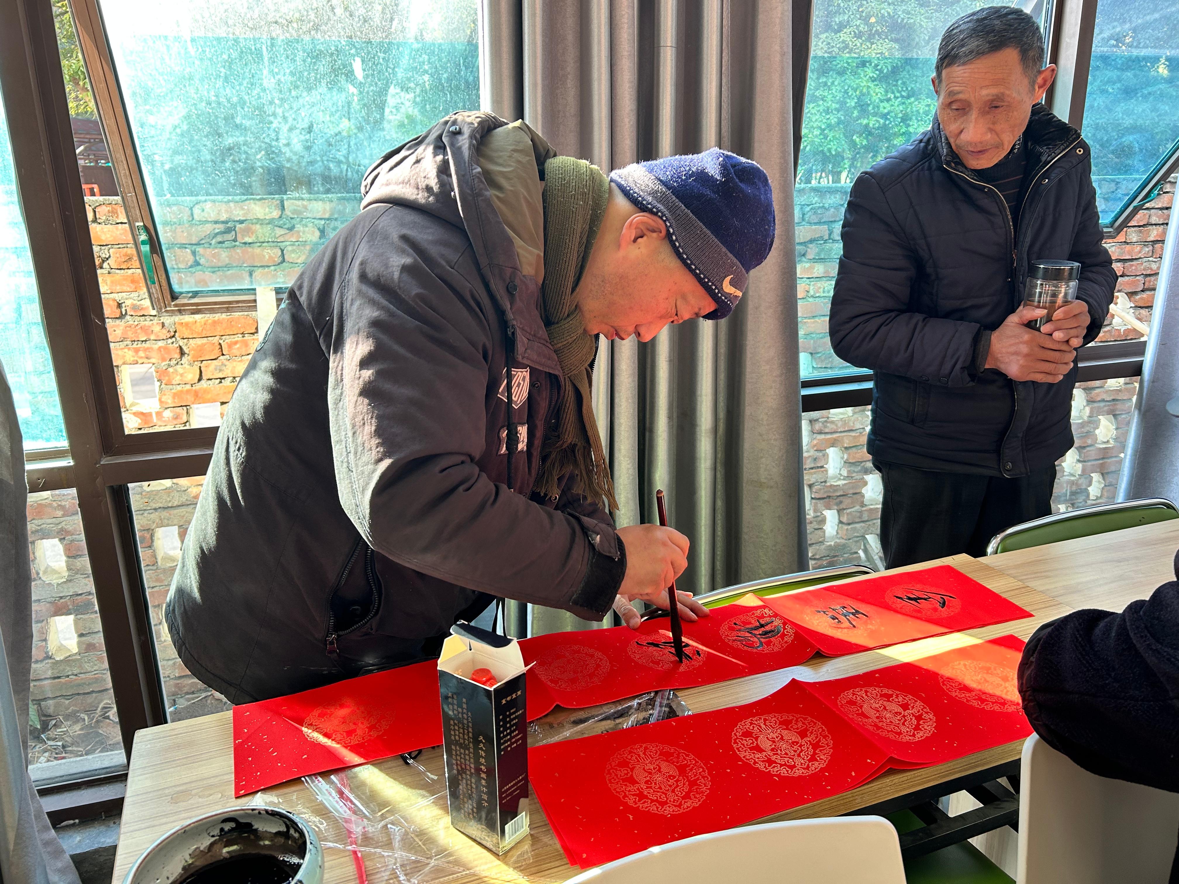 笔墨飘香送福,春联传递温情。另一边的写春联区域同样人气高涨。嘉兴市书法协会的老师挥毫泼墨,根据居民需求书写个性化春联。“健康如意春常在,平安吉祥福永存”……一幅幅寓意吉祥的春联和“福”字铺满桌面,居民们争相挑选心仪的作品。