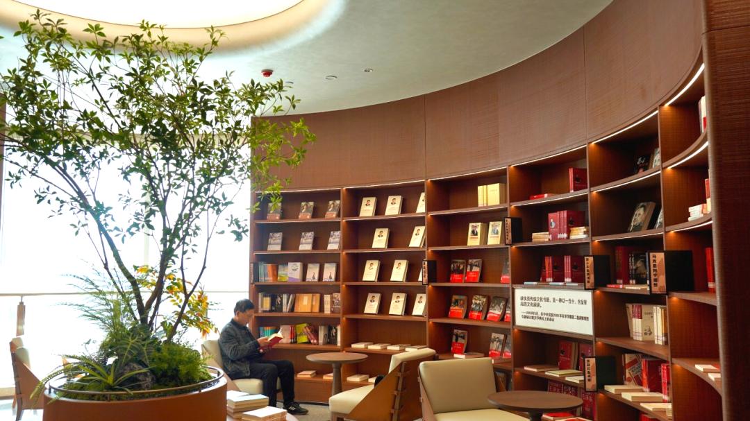 “生活不是等待暴风雨过去,而是学会在雨中跳舞。”“太阳照常升起,黎明总会到来。”……经典文学的摘录与感悟以雅致的字体点缀在书架之间、墙隅和转角。三层缓缓升高的台阶,形成错落有致的“梯田式”阅读区。读者可随意落座,以最舒展的姿态沉浸于书海。台阶之上,中外诗歌、小说与散文分层陈列,总能找到阅读爱好者的心仪之书。