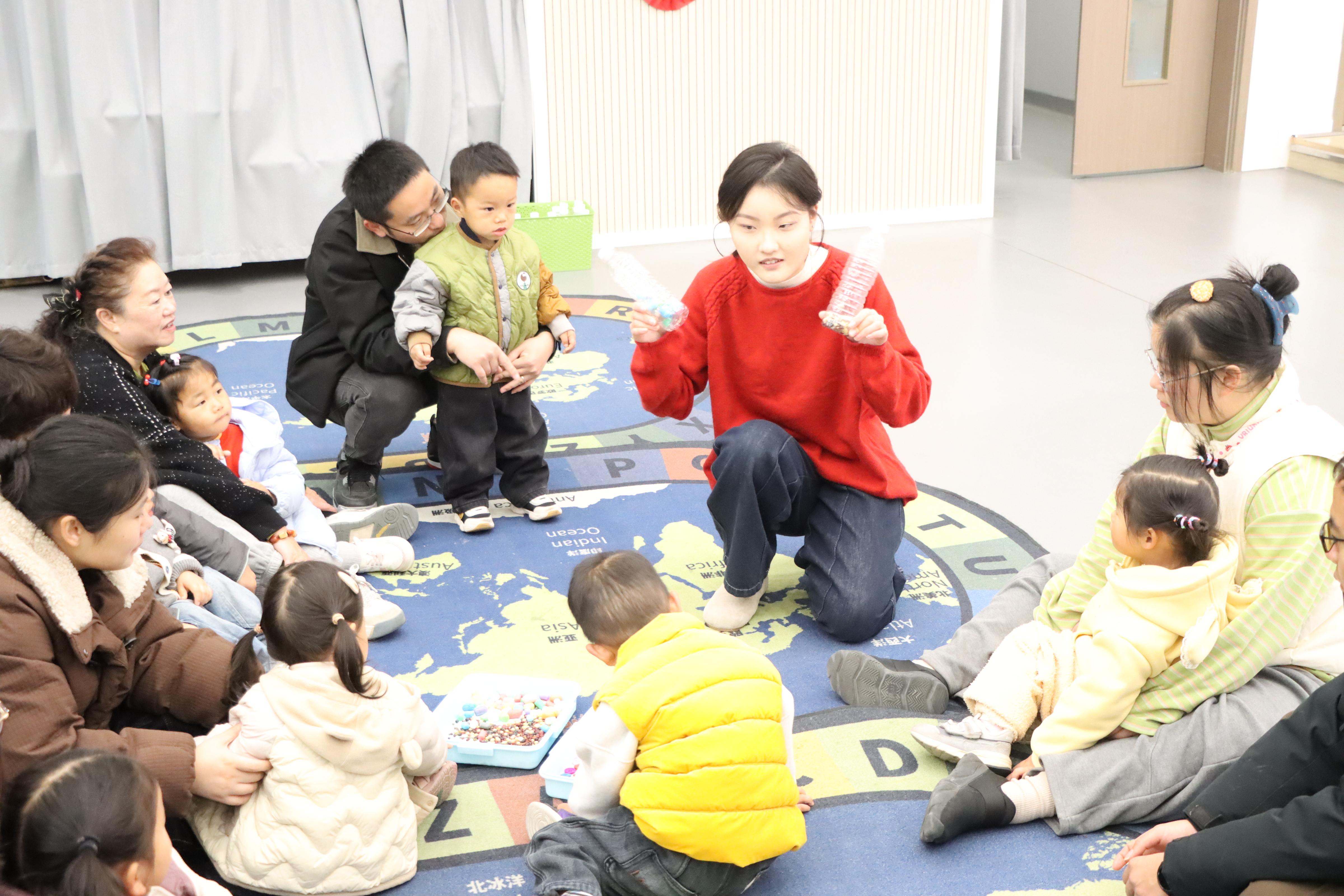 “小朋友们,你们看这个红红的、圆圆的叫什么呀?”活动中,老师指着墙上挂着的灯笼,笑着向孩子们提问。宝宝们仰着小脸,纷纷伸出小手比划:“灯——笼!”在轻快的春节乐曲中,老师带领家长和孩子一起认识现场布置的各式新年装饰,从春联到“福”字,从彩带到年画,一边讲解习俗,一边互动跟读。随后的创意音乐环节更是笑语不断:“我们把纽扣装进瓶子里,摇一摇,听听是什么声音?”一位妈妈握着宝宝的手轻轻晃动瓶子,宝宝眼睛一亮:“哗啦啦,像下雨!”通过不同的动作与节奏变化,孩子们在游戏中感知音乐,萌发最初的艺术感知。