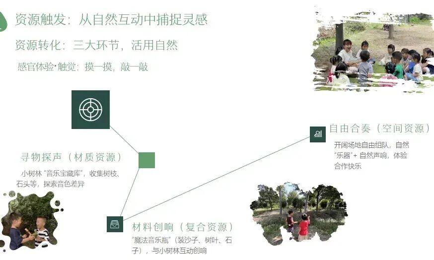 打破场域限制,小树林、自由地、活动室等皆为创意舞台,孩子们在林间开展音乐游戏、肢体创意表演,还巧用稻草等本土材料进行手工创作,让想象力与创造力在自由表达中尽显十足劲儿。