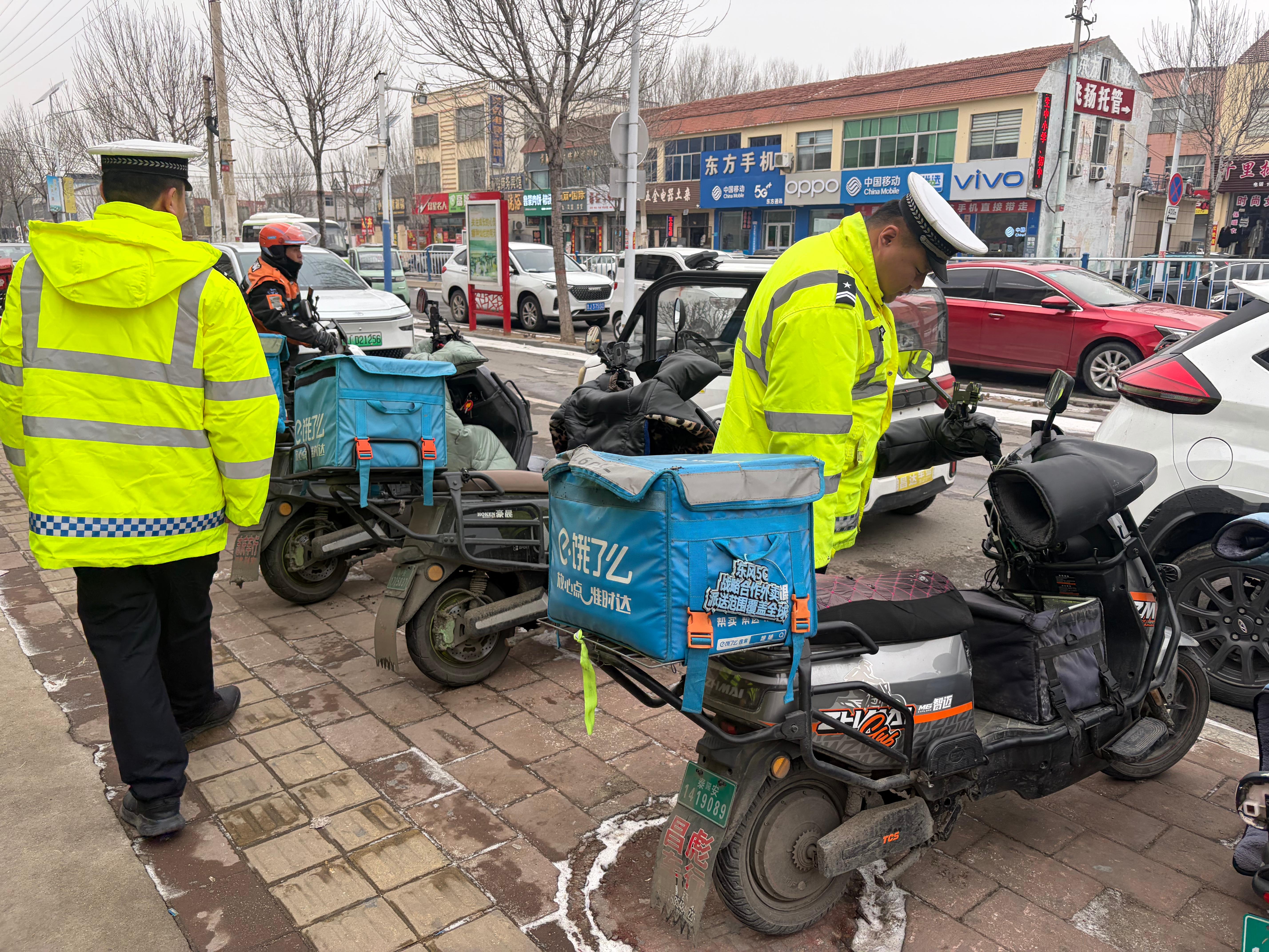 社区文化网(李涛 报道 通讯员 黄美弟)为进一步加强夜间及恶劣天气条件下电动车通行安全管理,全力预防和减少因“黑尾”引发的道路交通事故,纵深推进“冬季守护”行动,1月19日至20日,泰安交警岱西大队通过路口检查+站点突击相结合的方式,对辖区内“两员”(快递员、外卖员)群体电动车反光标识粘贴情况开展专项检查,切实关爱“两员”生命财产安全和道路通行秩序良好。