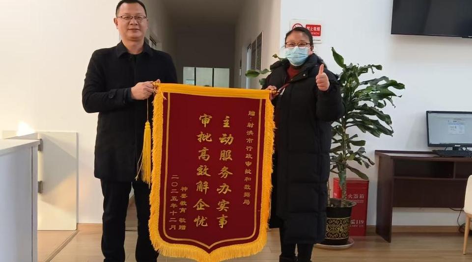 进入审批流程后,射洪市行政审批和数据局工作人员全程提供精准服务。细致协助企业核对、完善申报材料;为减轻企业负担,采用银行进账单替代第三方验资报告,节约资金约两千元;主动协调主管部门开展联合踏勘,推动场所一次性验收通过;最终依托OA系统实现快速审批,第一时间向企业送达批复及办学许可证。企业负责人专程送来印有“主动服务办实事,审批高效解企忧”的锦旗,对审批服务的高效与暖心表示高度认可和由衷感谢。