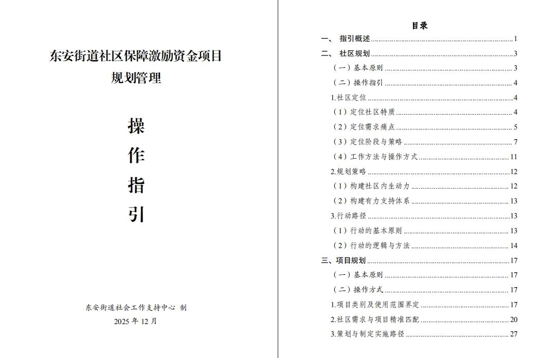《社区规划指引》以社区整体视角出发,确立“需求导向、阶段适配、可持续性”原则,将“培力-行动-移交”闭环和公益产品思维前置。建立“社区发展阶段—需求类型—项目方向”三维匹配模型及“培育期—成长期—成熟期”进阶机制,确保资源精准投放与项目可持续成长。强调项目设计必须包含清晰的能力培育、组织孵化、机制移交路径及可验证的实体化、制度化成果目标。 两项《指引》相辅相成,前者为评估提供标尺,后者为规划设定规则。明确街道、社区、社会组织、居民四方权责,共同构建覆盖项目“规划-执行-评估”全生命周期的闭环管理体系,确保资金效能最大化。 以创新体系驱动项目质效跃升 “本次训练营活动和两项《指引》的推出,是东安街道推动社区保障资金从‘花钱买活动’向‘投资买产品’战略转型的关键一步。”街道相关负责人表示,“我们不仅要让社区工作者‘会评估’,更要为他们提供评估的‘标尺’和规划的‘蓝图’,确保每个项目都瞄准真问题、产生真实效、留下真能力。”