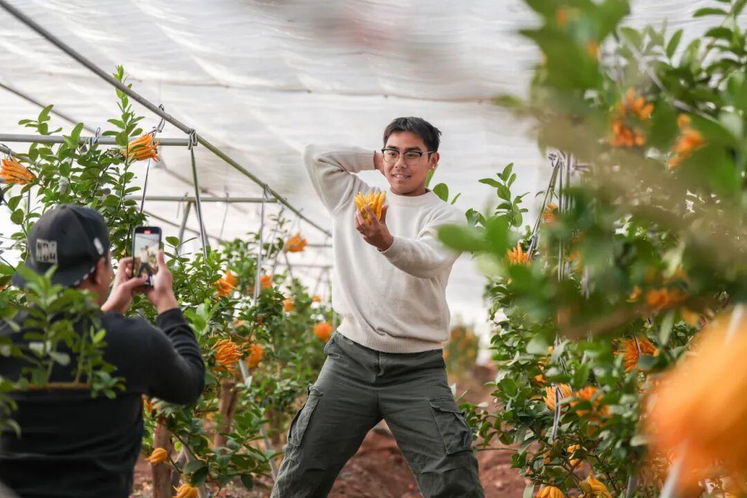 青年来了,流量也来了。“姐姐,买佛手吗?”天马行空的创意、抽象搞笑的舞蹈,00后主播金征科为了让家乡佛手“出圈”“破圈”,另辟蹊径,拍视频、做直播,在互联网平台走出了一条融合美学与农学的“花路”,也架起了通往更广阔市场的“流量之桥”。如今,“佛手小金”成了网红,订单纷至沓来。从2025年夏天开始,“佛手小金”陆续帮助26家农户带货,销售了近100个大棚的佛手鲜果及盆栽。