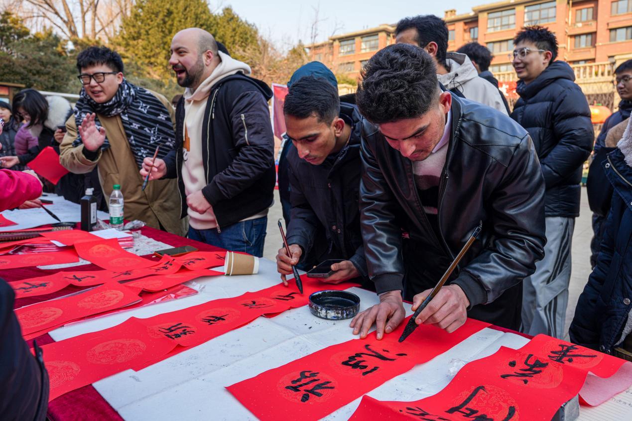 活动现场,留学生们一边品尝香甜软糯的腊八粥,一边亲手制作晶莹剔透的冰糖葫芦,在舌尖与指尖的双重体验中感受传统节日的韵味。剪纸传承人现场展示精湛技艺,细致解读锦鲤等传统纹样所蕴含的吉祥寓意,让留学生们在一折一剪间读懂中华文化的美好祝福。书法桌前,留学生们握起毛笔,认真书写春联,墨香四溢间,跨文化的温情在笔尖缓缓流淌。