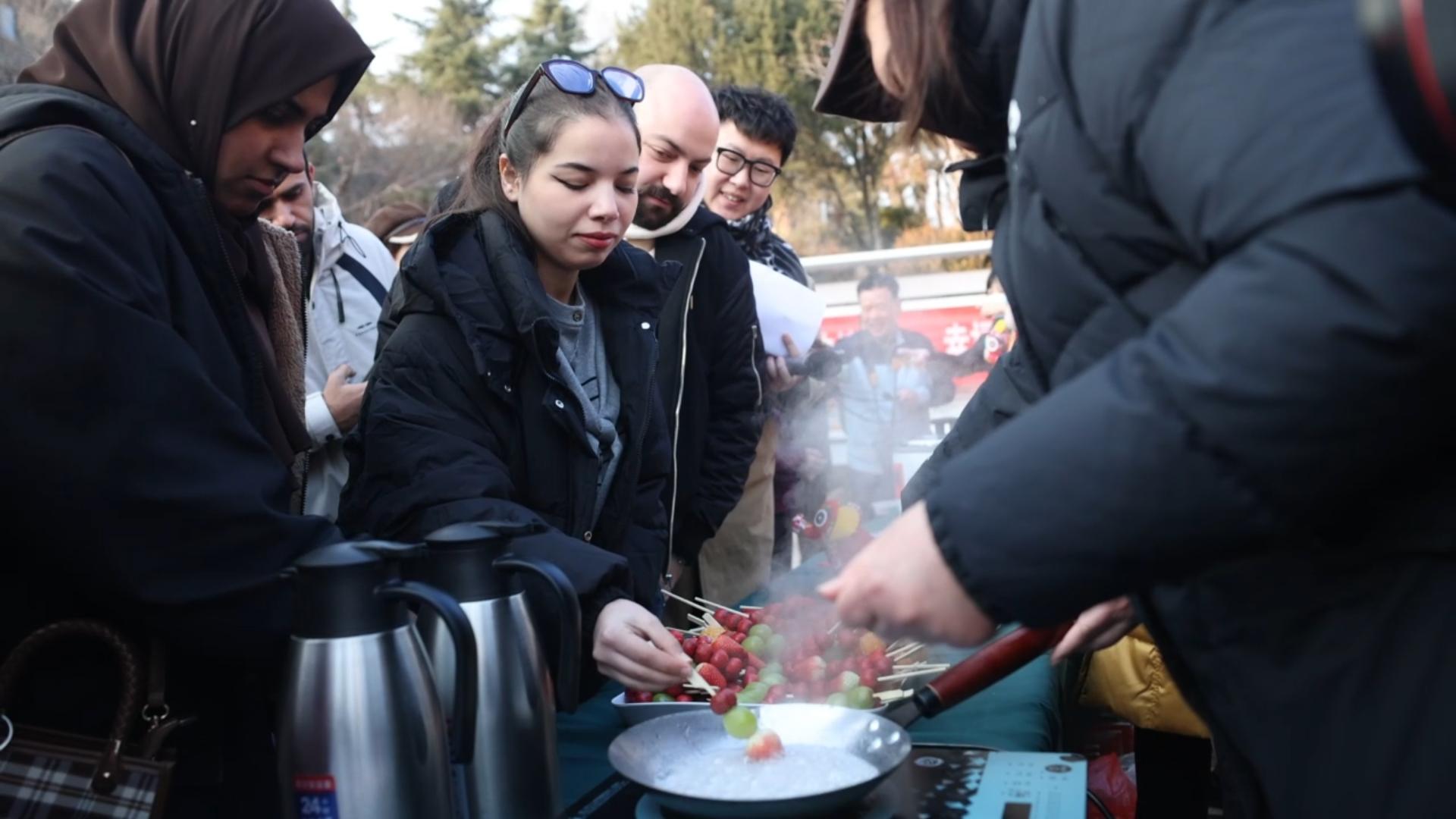 摩洛哥留学生DOUAA KANAANE说:“今天的腊八活动,我最喜欢的环节是写祝福和做冰糖葫芦,糖葫芦吃起来酸甜可口,太美味了。”