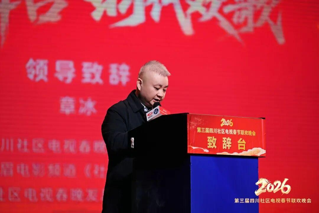 本届晚会以“万家灯火映蓉城·同心共赴中国年”为主题,由四川电视台峨眉电影频道《社区观察》栏目发起并主办,四川电影电视学院舞蹈学院提供全程艺术协办,北京惠蜂科技集团、成都亚非牙科有限公司担任全程战略合作伙伴。活动自海选以来,覆盖全川,最终呈现的总汇演,堪称一场从社区土壤中生长出来的、带着露珠与芬芳的“人民文艺”精品荟萃。 一、从“观赏”到“参与”:社区文化生命力的迸发 社区文化的核心在于“人的参与”。本届春晚最显著的特征,是实现了从“办给群众看”到“群众自己演”的深刻转变。晚会发起人、总策划,四川电视台峨眉电影频道《社区观察》栏目制片人章冰在致辞中指出,该品牌自2024年创立之初,便确立了“百姓舞台,群众主角”的核心理念。从第一届的初步探索,到第二届的模式成型,再到第三届的规模与品质双飞跃,其发展轨迹清晰地映射出基层群众日益高涨的文化主体意识和参与热情。