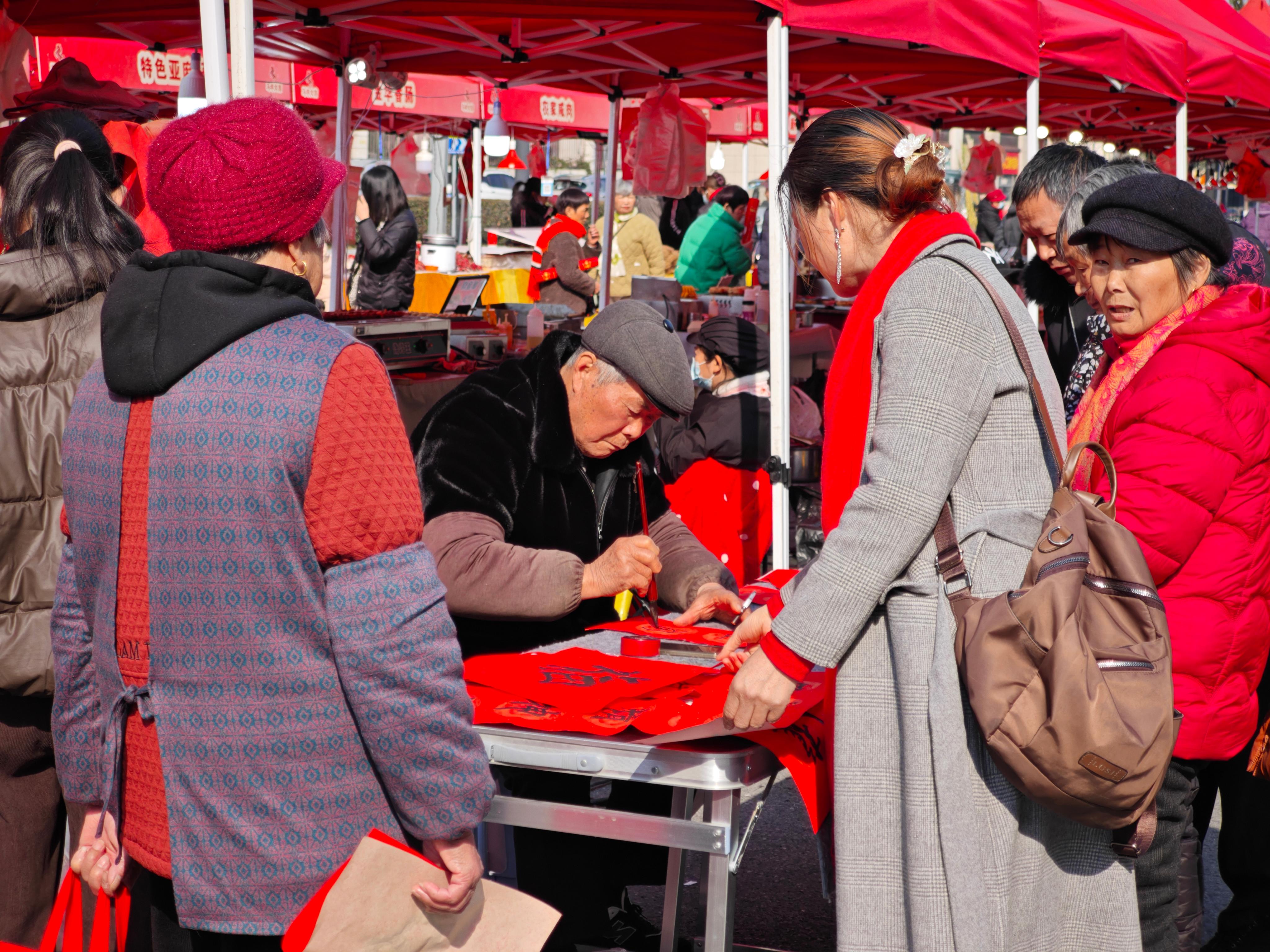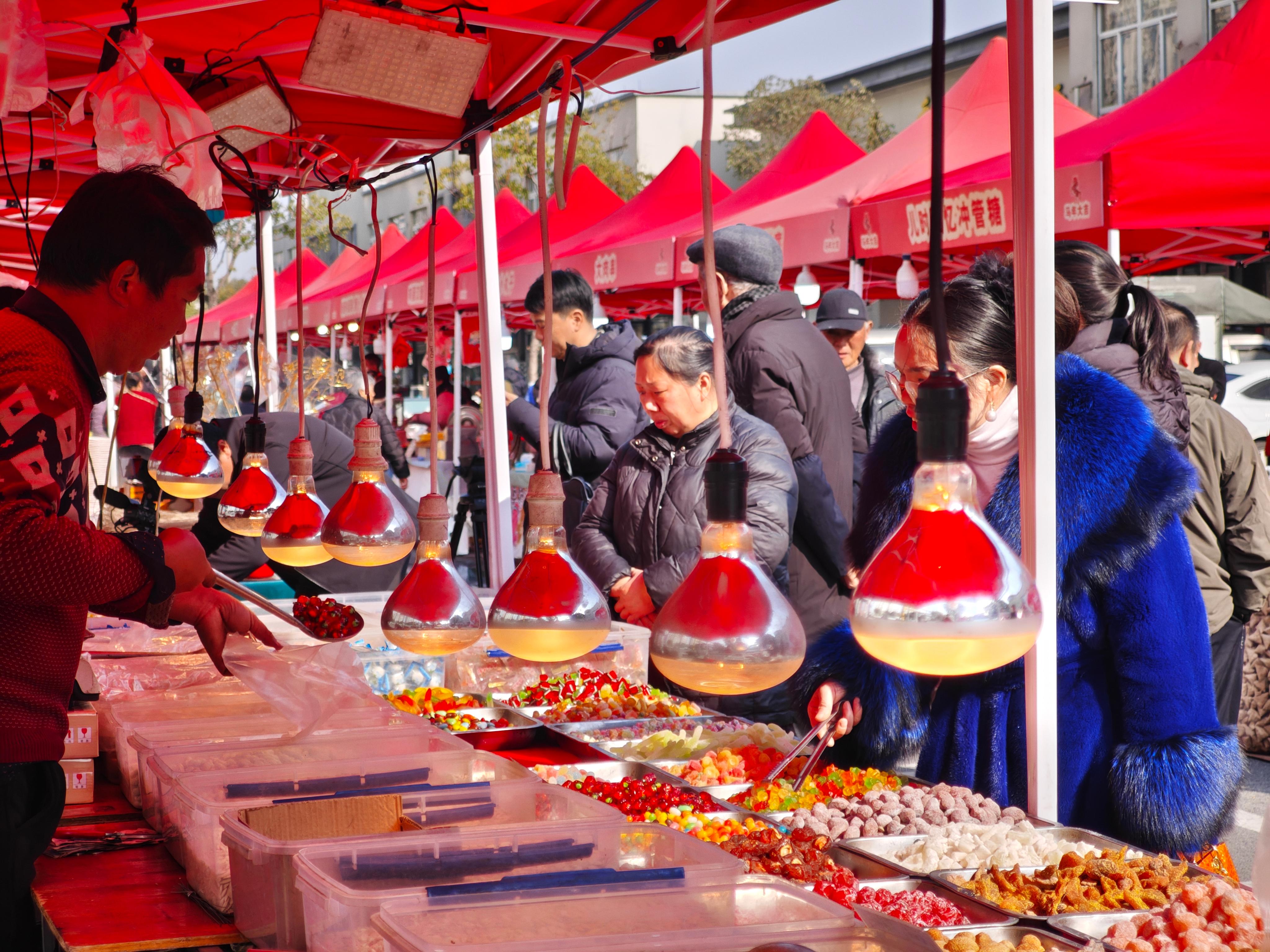 当天下午,伴随着茶园大鼓队铿锵有力的鼓点声,年货集市正式拉开帷幕。鼓声阵阵,不仅奏响了新年的喜悦,更点燃了现场居民的热情,为整个活动营造出浓浓的年味和欢乐氛围。走进集市,糖果炒货、酱鸭腊肉、春联福字摊位依次排开,吆喝声此起彼伏。居民们穿梭选购,孩子们围着糖画摊舍不得走,刚出炉的葱油小烧饼香气蒸腾,伴着鼓点与笑声,把“年”写进热气腾腾的烟火里。
